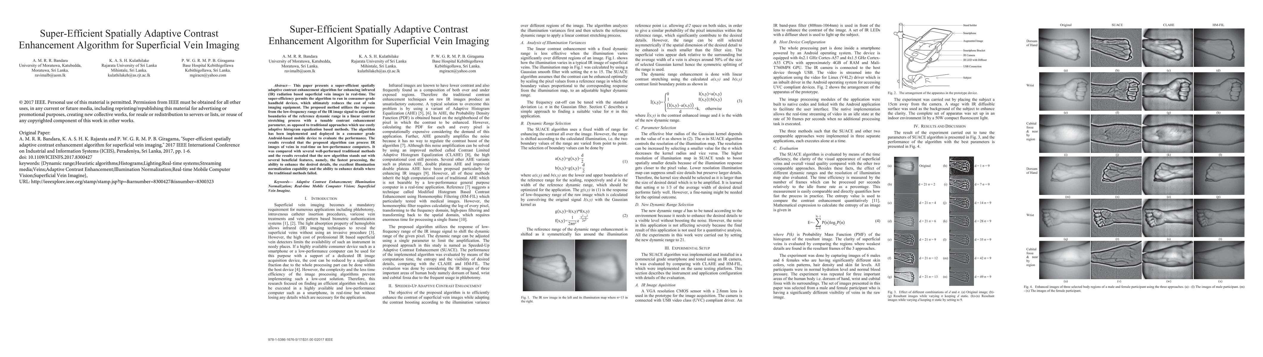 A new contrast enhancement algorithm enhances infrared radiation images of superficial veins in real-time on low-performance devices, outperforming traditional methods with faster processing and improved detail enhancement.