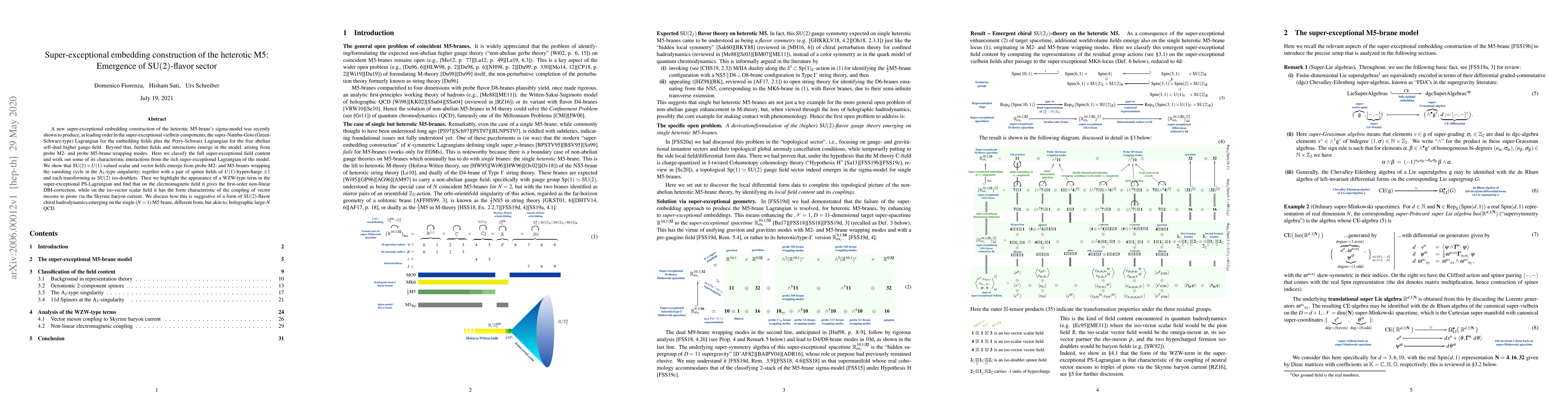 This paper constructs a super-exceptional embedding for the heterotic M5-brane, revealing an SU(2)-flavor sector with emergent scalar and vector fields from probe M2- and M5-branes. It also identifies a WZW-type term leading to non-linear DBI-corrections and SU(2)-flavor chiral hadrodynamics akin to holographic large-$N$ QCD.