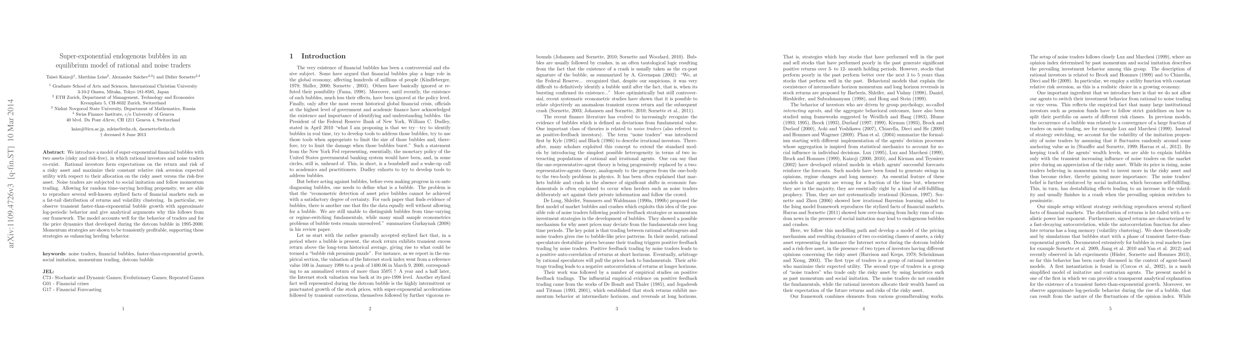 This paper develops a financial model featuring super-exponential bubbles driven by rational and noise traders. It captures market phenomena like fat-tail distributions and volatility clustering, explaining the dotcom bubble's dynamics through transient faster-than-exponential growth and log-periodic behavior.