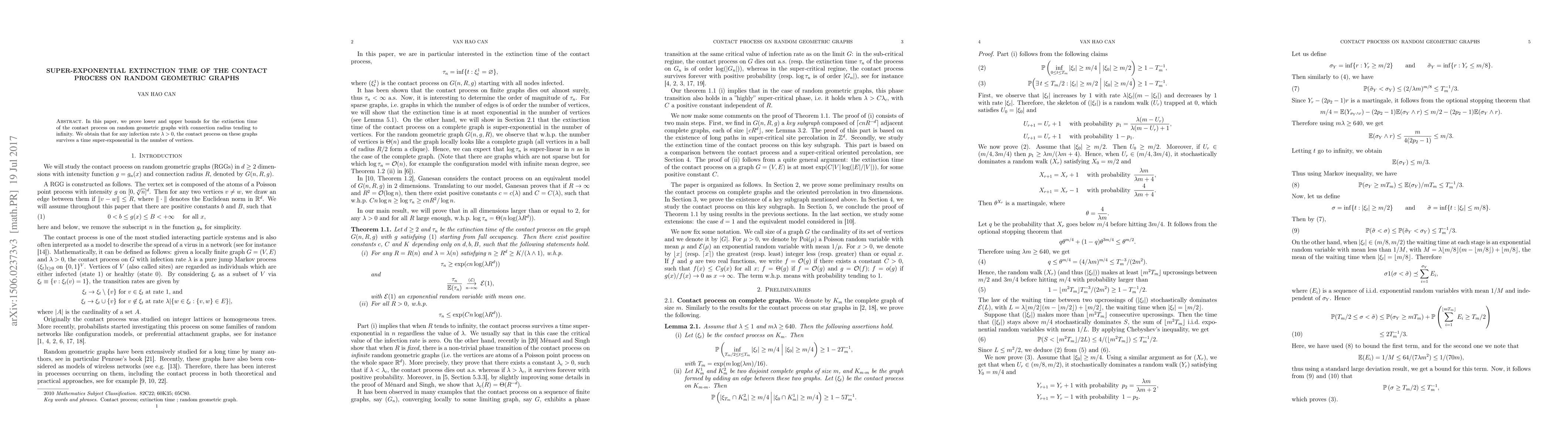 Summary: This paper establishes lower and upper bounds showing that the contact process on random geometric graphs with large connecting radius survives for a time that is super-exponential in the number of vertices, regardless of the infection rate $\lambda >0$.