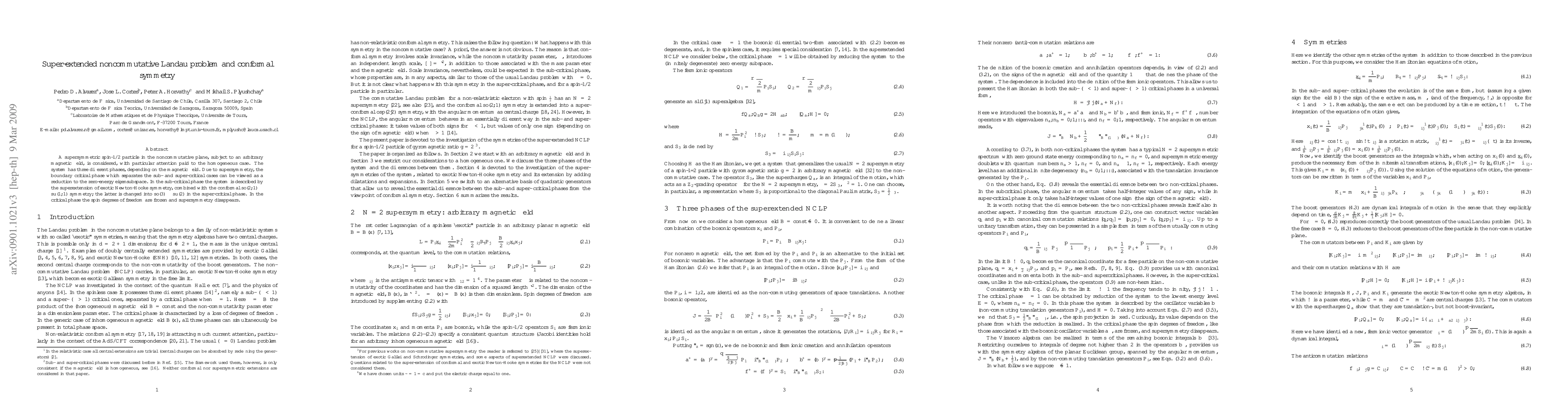 A supersymmetric spin-1/2 particle in the noncommutative plane, subject to an arbitrary magnetic field, is considered, with particular attention paid to the homogeneous case. The system has three different phases, depending on the magnetic field. Due to supersymmetry, the boundary critical phase which separates the sub- and super-critical cases can be viewed as a reduction to the zero-energy eigensubspace. In the sub-critical phase the system is described by the superextension of exotic Newton-Hooke symmetry, combined with the conformal so(2,1) ~ su(1,1) symmetry; the latter is changed into so(3) ~ su(2) in the super-critical phase. In the critical phase the spin degrees of freedom are frozen and supersymmetry disappears.