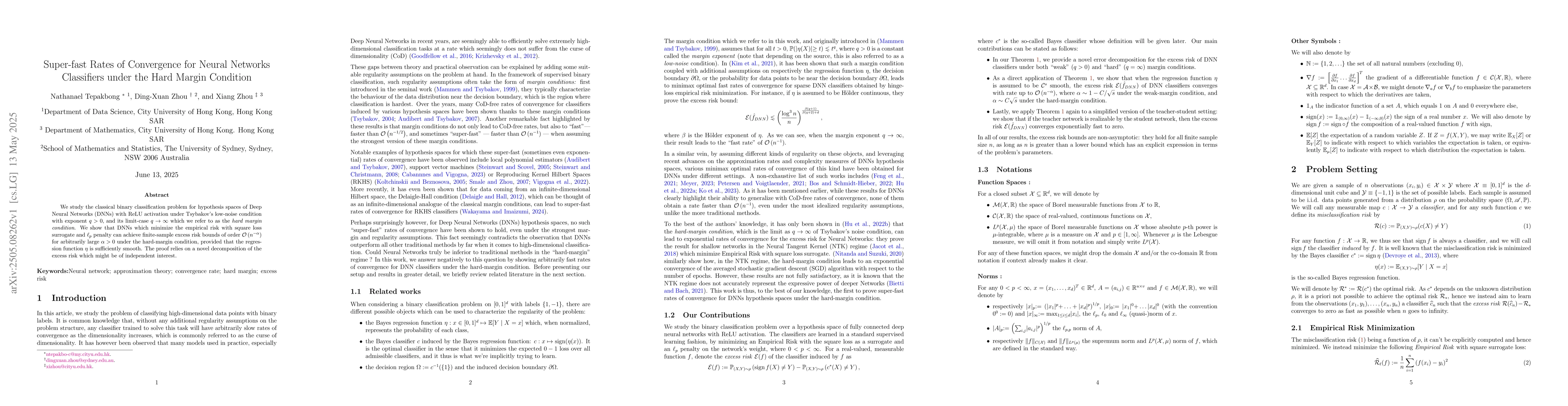 The research investigates binary classification problems using Deep Neural Networks (DNNs) with ReLU activation, focusing on Tsybakov's low-noise condition and its limit-case, the 'hard-margin condition'. It examines DNNs minimizing empirical risk with square loss and ℓ_p penalty, demonstrating finite-sample excess risk bounds under specific smoothness conditions of the regression function.