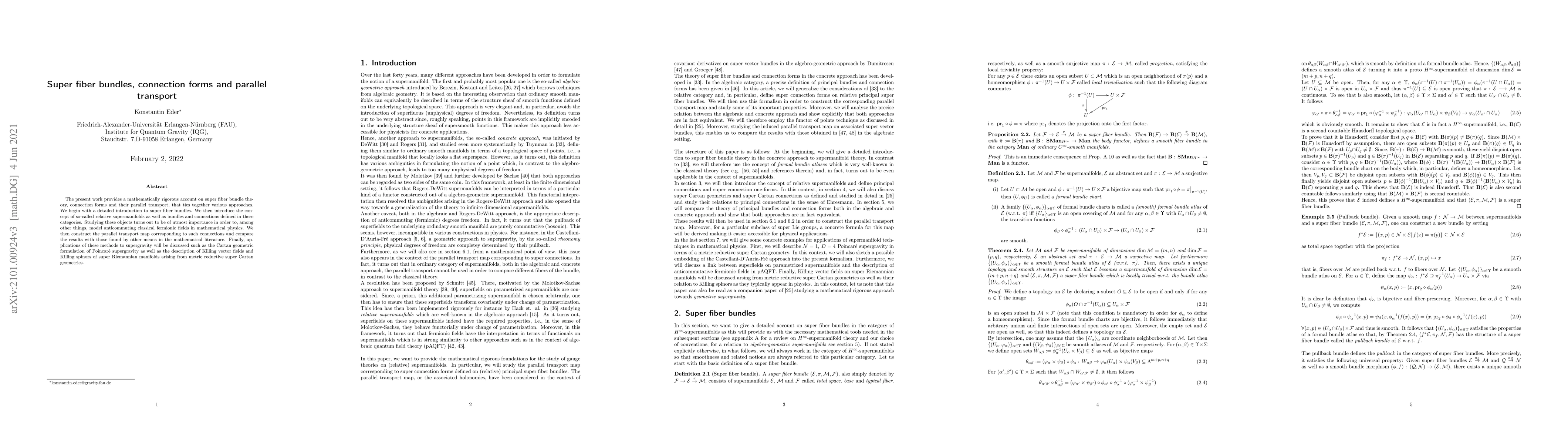 This research paper provides a mathematically rigorous account of super fiber bundle theory, connection forms, and parallel transport, with implications for modeling anticommuting classical fermionic fields in mathematical physics.