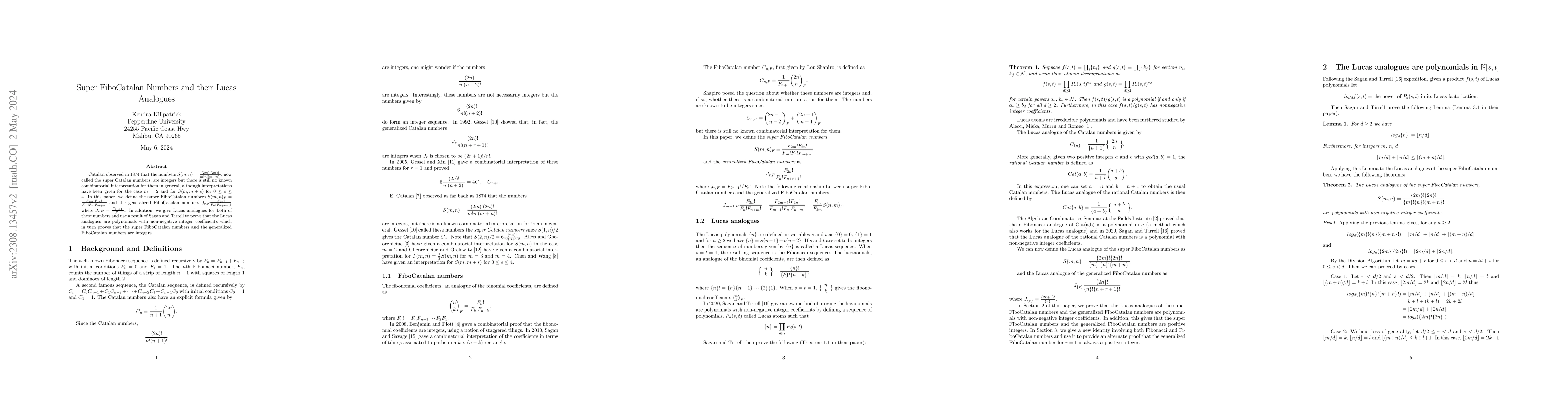 Catalan observed in 1874 that the numbers $S(m,n) = \frac{(2m)! (2n)!}{m! n! (m+n)!}$, now called the super Catalan numbers, are integers but there is still no known combinatorial interpretation for them in general, although interpretations have been given for the case $m=2$ and for $S(m, m+s)$ for $0 \leq s \leq 4$. In this paper, we define the super FiboCatalan numbers $S(m,n)_F = \frac{F_{2m}! F_{2n}!}{F_m! F_n! F_{m+n}!}$ and the generalized FiboCatalan numbers $J_{r,F} \frac{F_{2n}!}{F_n! F_{n+r+1}!}$ where $J_{r,F} = \frac{F_{2r+1}!}{F_r!}$. In addition, we give Lucas analogues for both of these numbers and use a result of Sagan and Tirrell to prove that the Lucas analogues are polynomials with non-negative integer coefficients which in turn proves that the super FiboCatalan numbers and the generalized FiboCatalan numbers are integers.
