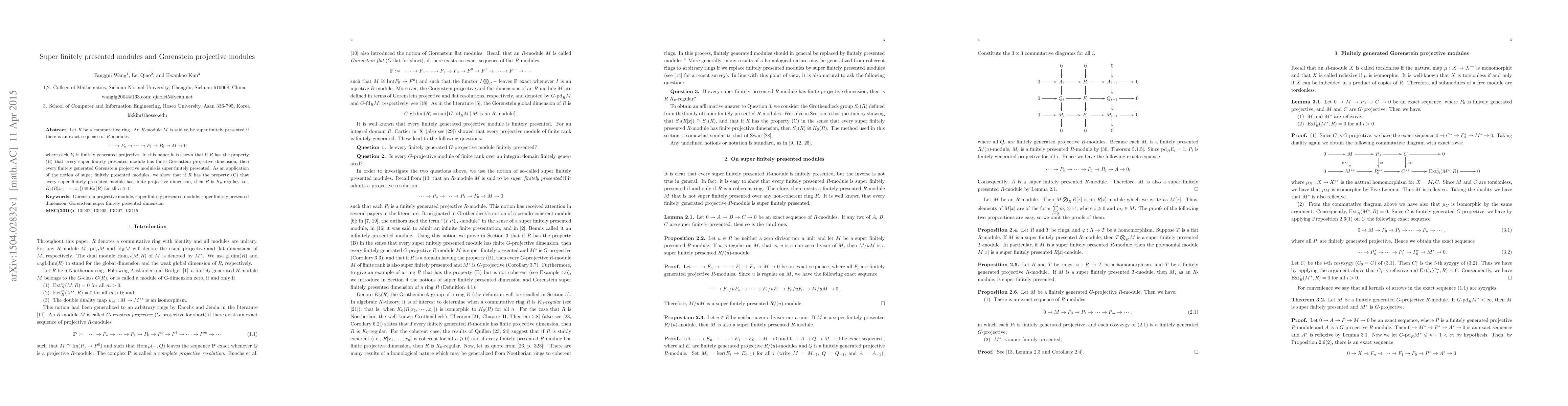 Let $R$ be a commutative ring. An $R$-module $M$ is said to be super finitely presented if there is an exact sequence of $R$-modules $\cdots\rightarrow P_n\rightarrow\cdots \rightarrow P_1\rightarrow P_0\rightarrow M\rightarrow 0$ where each $P_i$ is finitely generated projective. In this paper it is shown that if $R$ has the property (B) that every super finitely presented module has finite Gorenstein projective dimension, then every finitely generated Gorenstein projective module is super finitely presented. As an application of the notion of super finitely presented modules, we show that if $R$ has the property (C) that every super finitely presented module has finite projective dimension, then $R$ is $K_0$-regular, i.e., $K_0(R[x_1,\cdots,x_n])\cong K_0(R)$ for all $n\geq 1$.