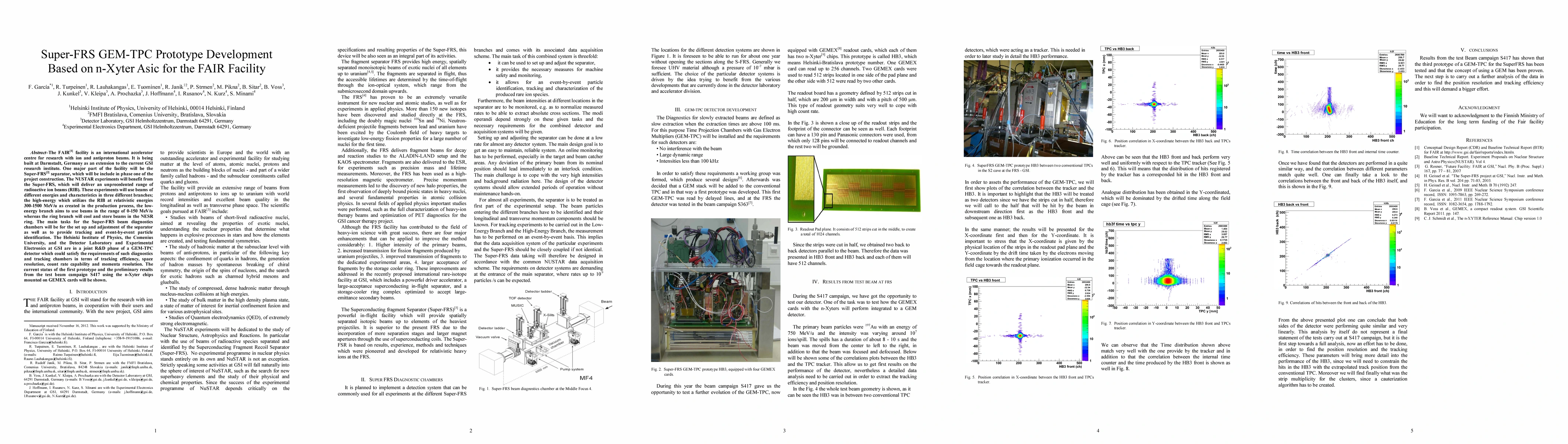 The FAIR facility is an international accelerator centre for research with ion and antiproton beams. It is being built at Darmstadt, Germany as an extension to the current GSI research institute. One major part of the facility will be the Super-FRS separator, which will be include in phase one of the project construction. The NUSTAR experiments will benefit from the Super-FRS, which will deliver an unprecedented range of radioactive ion beams (RIB). These experiments will use beams of different energies and characteristics in three different branches; the high-energy which utilizes the RIB at relativistic energies 300-1500 MeV /u as created in the production process, the low energy branch aims to use beams in the range of 0-150 MeV/u whereas the ring branch will cool and store beams in the NESR ring. The main tasks for the Super-FRS beam diagnostics chambers will be for the set up and adjustment of the separator as well as to provide tracking and event-by-event particle identification. The Helsinki Institute of Physics, the Comenius University, and the Detector Laboratory and Experimental electronics at GSI are in a joint R&D phase of a GEM-TPC detector which could satisfy the requirements of such diagnostics and tracking chambers in terms of tracking efficiency, space resolution, count rate capability and momenta resolution. The current status of the first prototype and the preliminary results from the test beam campaign S417 using the n-Xyter chips mounted on GEMEX cards will be shown.