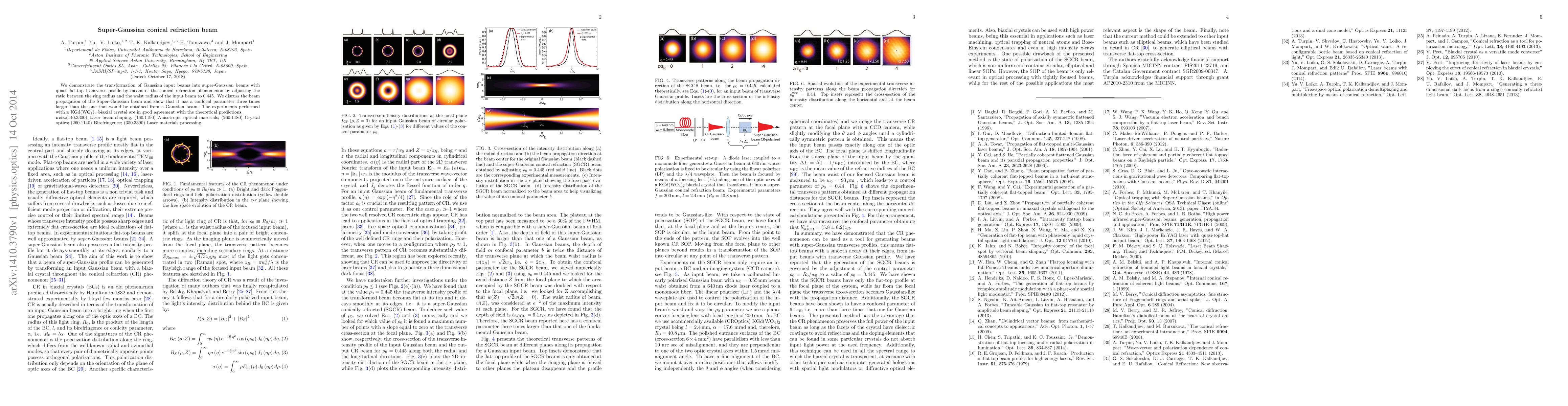 This paper demonstrates the conversion of Gaussian beams into super-Gaussian beams with a flat-top profile via conical refraction, optimizing the ratio of ring radius to waist radius. The resulting super-Gaussian beams exhibit a confocal parameter three times larger than Gaussian beams, validated by experiments using a KGd(WO4)2 crystal.