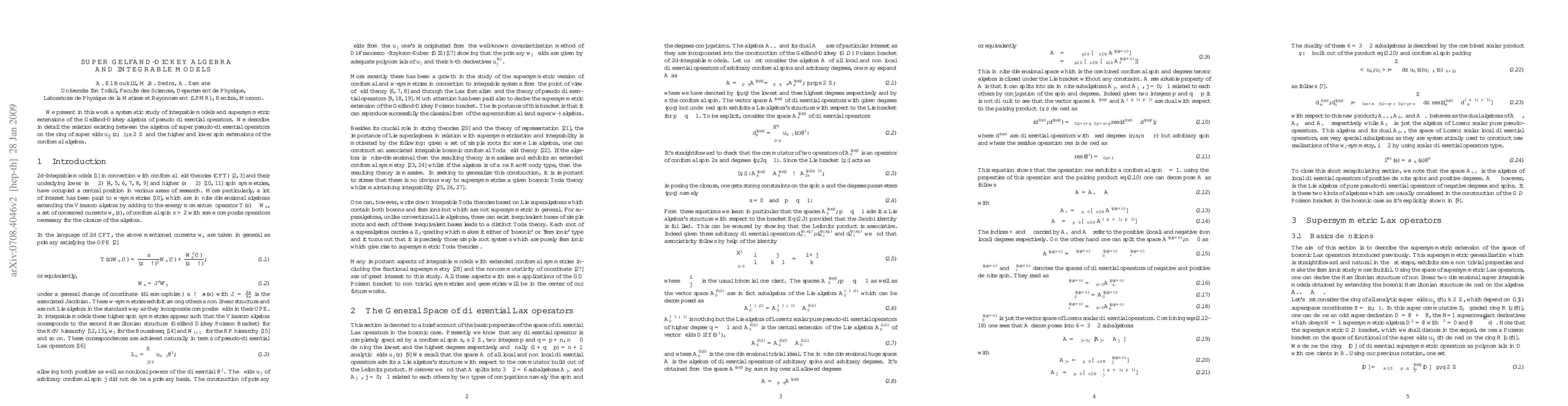 We present in this work a systematic study of integrable models and supersymmetric extensions of the Gelfand-Dickey algebra of pseudo differential operators. We describe in detail the relation existing between the algebra of super pseudo-differential operators on the ring of superfields $u_{\frac{s}{2}}(z,\theta),s\in Z$ and the higher and lower spin extensions of the conformal algebra.