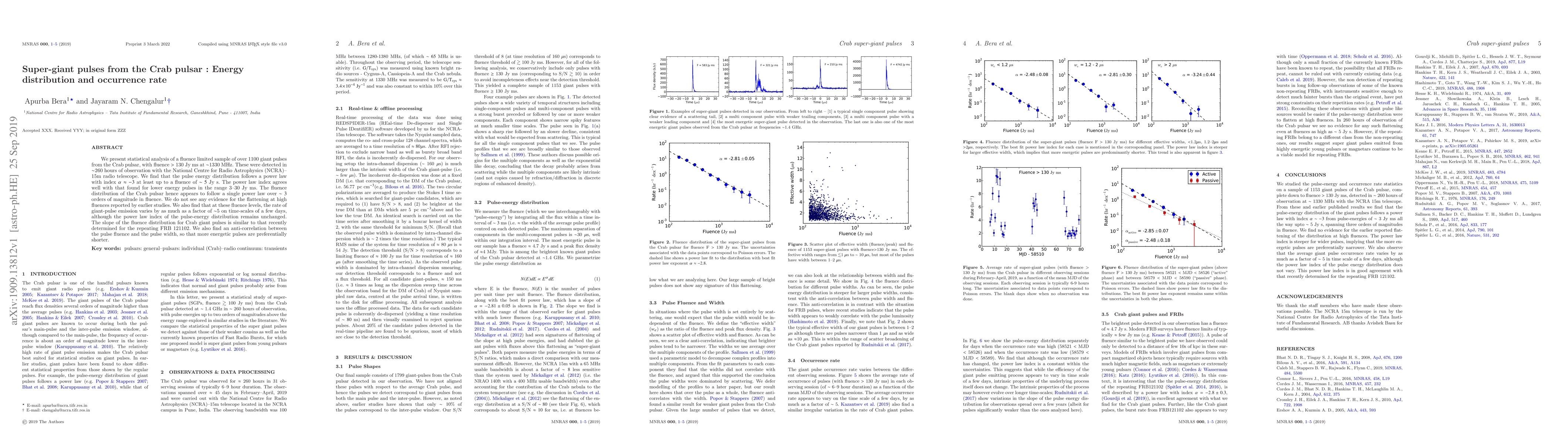 We present statistical analysis of a fluence limited sample of over 1100 giant pulses from the Crab pulsar, with fluence > 130 Jy ms at ~1330 MHz. These were detected in ~260 hours of observation with the National Centre for Radio Astrophysics (NCRA)-15m radio telescope. We find that the pulse energy distribution follows a power law with index $\alpha\approx$-3 at least up to a fluence of ~5 Jy s. The power law index agrees well with that found for lower energy pulses in the range 3-30 Jy ms. The fluence distribution of the Crab pulsar hence appears to follow a single power law over ~3 orders of magnitude in fluence. We do not see any evidence for the flattening at high fluences reported by earlier studies. We also find that at these fluence levels, the rate of giant-pulse emission varies by as much as a factor of ~5 on time-scales of a few days, although the power law index of the pulse-energy distribution remains unchanged. The slope of the fluence distribution for Crab giant pulses is similar to that recently determined for the repeating FRB 121102. We also find an anti-correlation between the pulse fluence and the pulse width, so that more energetic pulses are preferentially shorter.