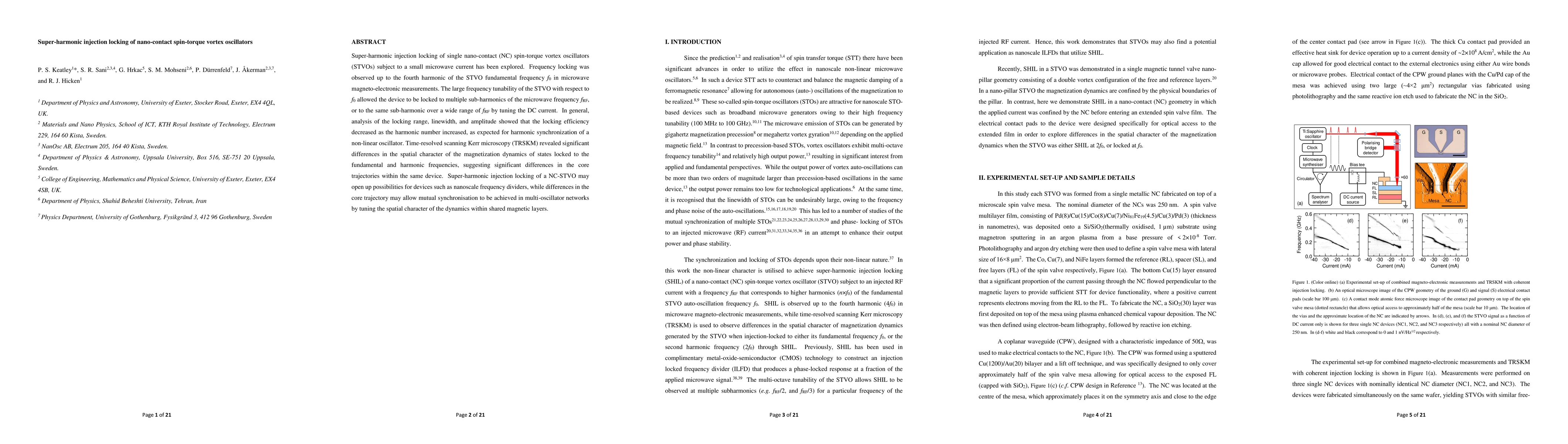 This paper explores super-harmonic injection locking in nano-contact spin-torque vortex oscillators, demonstrating frequency locking up to the fourth harmonic of the fundamental frequency. The study reveals that locking efficiency decreases with higher harmonics and suggests potential applications in nanoscale frequency dividers and multi-oscillator network synchronization.