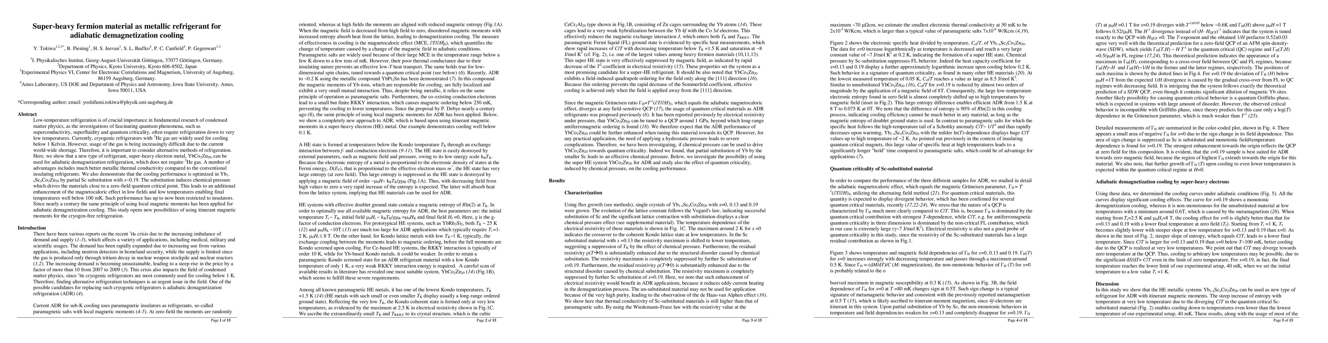 This paper explores the use of a super-heavy fermion material, YbCo$_2$Zn$_{20}$, for adiabatic demagnetization refrigeration, presenting a metallic alternative to traditional $^3$He gas refrigeration. The study shows that Yb$_{1-x}$Sc$_x$Co$_2$Zn$_{20}$ with $x\sim$0.19 achieves cooling performance well below 100 mK, leveraging enhanced magnetocaloric effects due to induced chemical pressure and proximity to a quantum critical point.