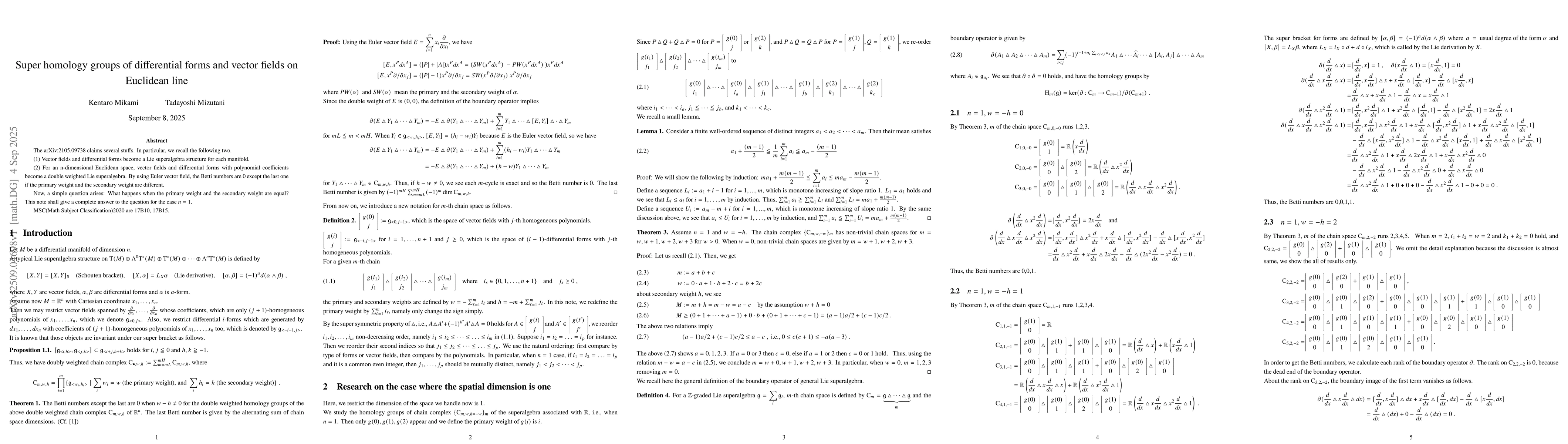 The arXiv:2105.09738 claims several stuffs. In particular, we recall the following two. (1) Vector fields and differential forms become a Lie superalgebra structure for each manifold. (2) For an n-dimensional Euclidean space, vector fields and differential forms with polynomial coefficients become a double weighted Lie uperalgebra. By using Euler vector field, the Betti numbers are 0 except the last one if the primary weight and the secondary weight are different. Now, a simple question arises: What happens when the primary weight and the secondary weight are equal? This note shall give a complete answer to the question for the case $n=1$.