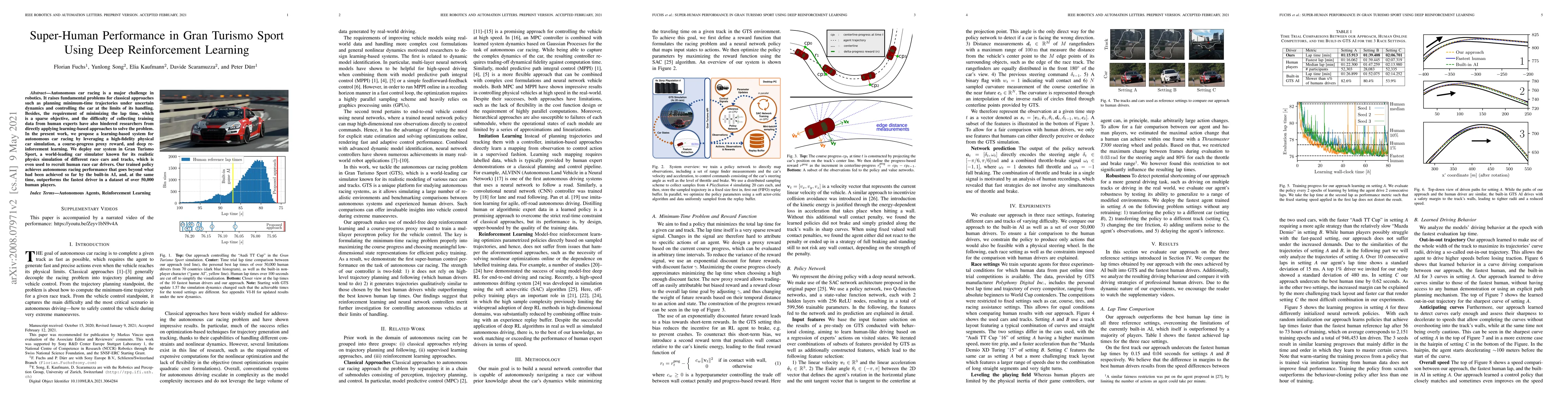 This paper proposes a deep reinforcement learning system for autonomous car racing in Gran Turismo Sport, achieving super-human performance by leveraging a high-fidelity simulation, course-progress rewards, and overcoming challenges like sparse objectives and data collection. The system outperforms both the built-in AI and the fastest human drivers in a dataset of over 50,000 players.