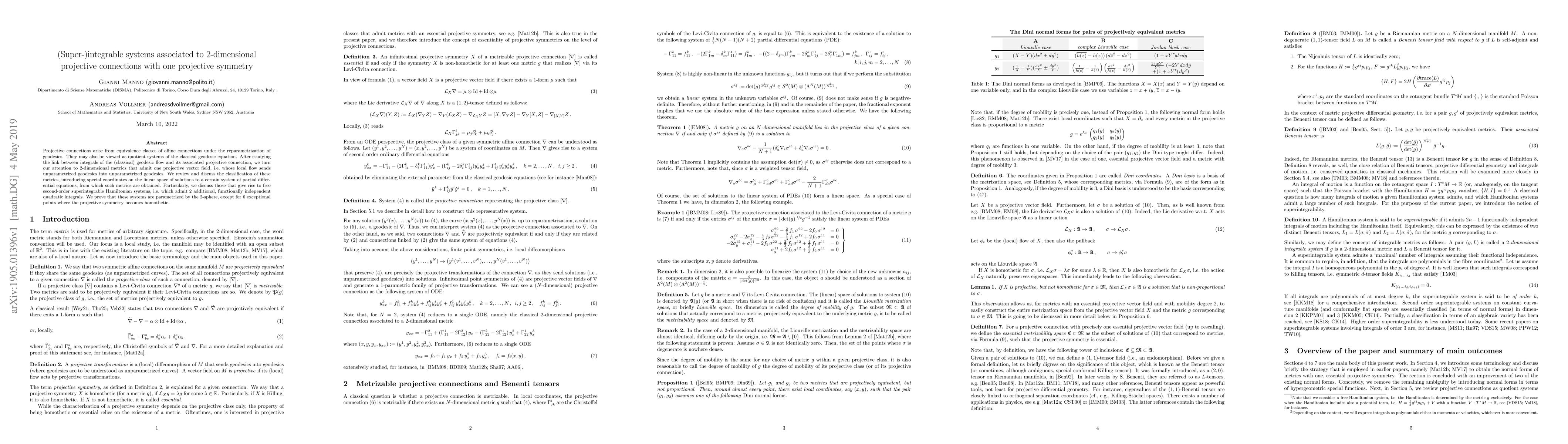 This paper explores 2-dimensional projective connections with a single projective symmetry, classifying metrics that preserve unparametrized geodesics. It identifies metrics leading to free second-order superintegrable Hamiltonian systems with two additional independent quadratic integrals, showing they are generally parametrized by the 2-sphere, except for six exceptional points.