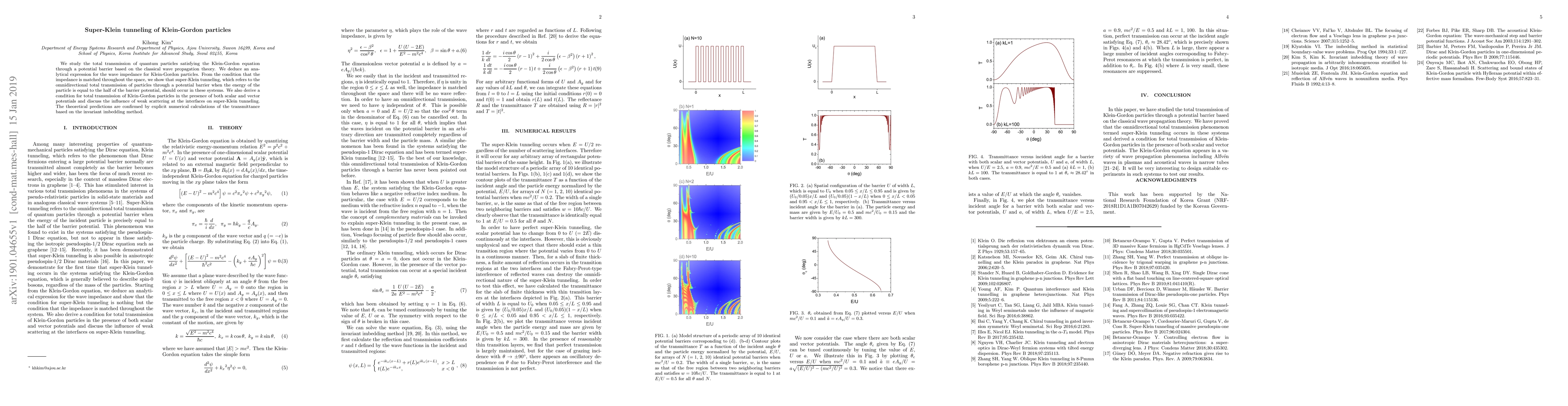 This paper explores the total transmission of Klein-Gordon particles through potential barriers, deriving an analytical expression for wave impedance and demonstrating the phenomenon of super-Klein tunneling at specific energy levels. Numerical simulations confirm the theoretical predictions of omnidirectional particle transmission under certain conditions.