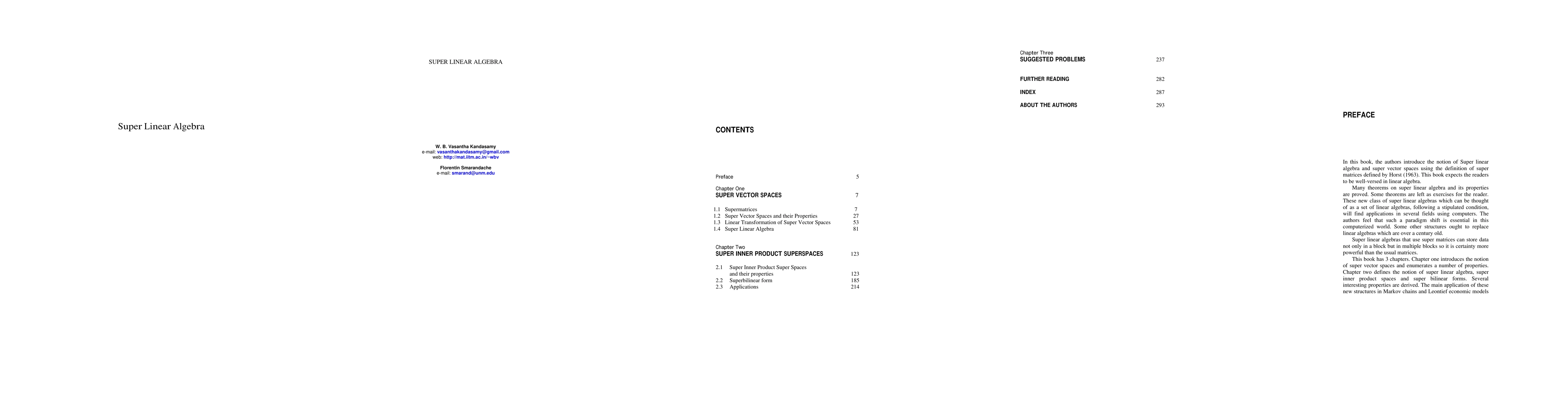 This book introduces the concept of super linear algebra and super vector spaces using super matrices, proving numerous theorems and leaving some as exercises. It proposes that super linear algebra, with its enhanced data storage capabilities, is a more powerful alternative to traditional linear algebra, with applications in Markov chains and economic models.