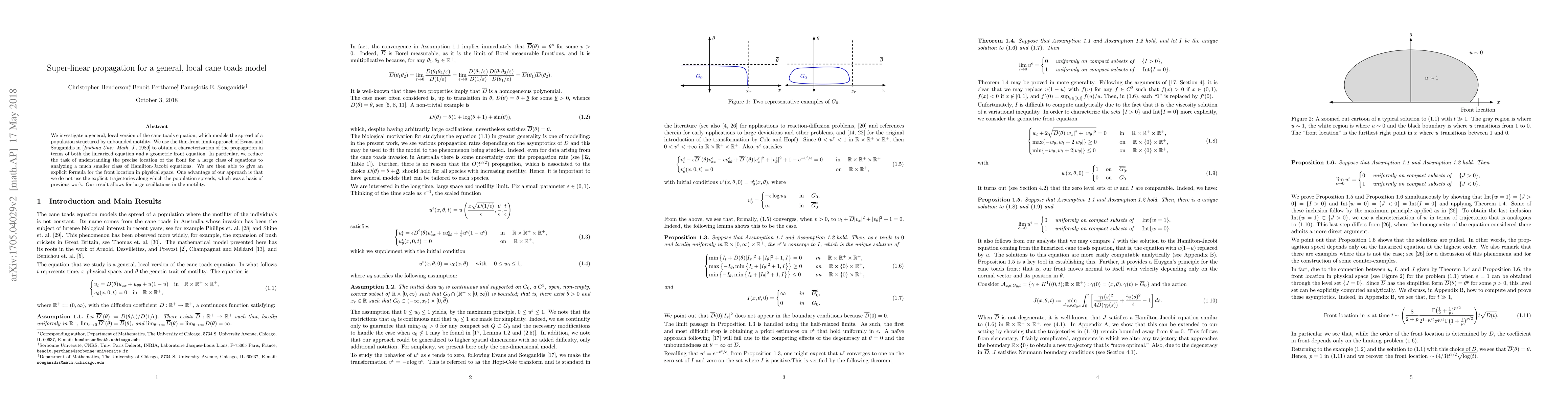 This research employs the thin-front limit approach to characterize the spread of cane toad populations, reducing complex problems to simpler Hamilton-Jacobi equations. It provides an explicit formula for front location without relying on specific spreading trajectories, accommodating significant motility variations.