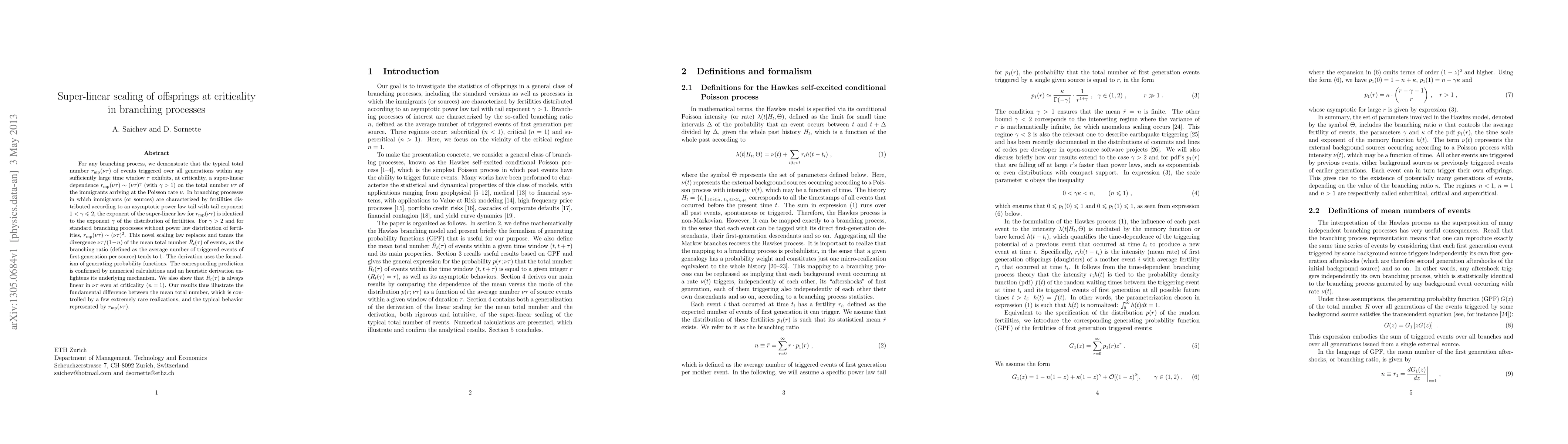 For any branching process, we demonstrate that the typical total number $r_{\rm mp}(\nu \tau)$ of events triggered over all generations within any sufficiently large time window $\tau$ exhibits, at criticality, a super-linear dependence $r_{\rm mp}(\nu \tau) \sim (\nu \tau)^\gamma$ (with $\gamma >1$) on the total number $\nu \tau$ of the immigrants arriving at the Poisson rate $\nu$. In branching processes in which immigrants (or sources) are characterized by fertilities distributed according to an asymptotic power law tail with tail exponent $1 < \gamma \leqslant 2$, the exponent of the super-linear law for $r_{\rm mp}(\nu \tau)$ is identical to the exponent $\gamma$ of the distribution of fertilities. For $\gamma>2$ and for standard branching processes without power law distribution of fertilities, $r_{\rm mp}(\nu \tau) \sim (\nu \tau)^2$. This novel scaling law replaces and tames the divergence $\nu \tau/(1-n)$ of the mean total number ${\bar R}_t(\tau)$ of events, as the branching ratio (defined as the average number of triggered events of first generation per source) tends to 1. The derivation uses the formalism of generating probability functions. The corresponding prediction is confirmed by numerical calculations and an heuristic derivation enlightens its underlying mechanism. We also show that ${\bar R}_t(\tau)$ is always linear in $\nu \tau$ even at criticality ($n=1$). Our results thus illustrate the fundamental difference between the mean total number, which is controlled by a few extremely rare realizations, and the typical behavior represented by $r_{\rm mp}(\nu \tau)$.