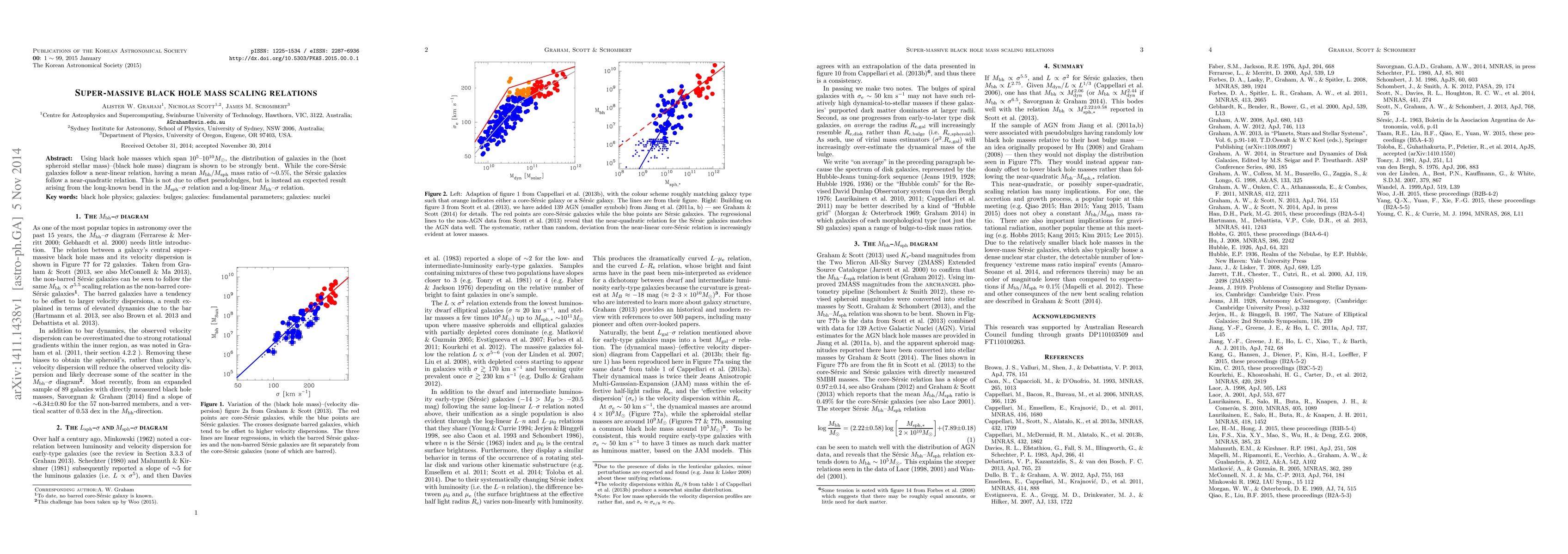 The research finds a strong bend in the (host spheroid stellar mass)-(black hole mass) diagram for super-massive black holes ranging from 10^5 to 10^(10) solar masses. Core-Sersic galaxies show a near-linear relation with a mean M_(bh)/M_(sph) mass ratio of ~0.5%, while Sersic galaxies exhibit a near-quadratic relation (M_bh~M_sph^(2.22+-0.58)). This quadratic relation for Sersic galaxies is attributed to the known bend in the M_(sph)-sigma relation and the log-linear M_(bh)-sigma relation, rather than offset pseudobulges.