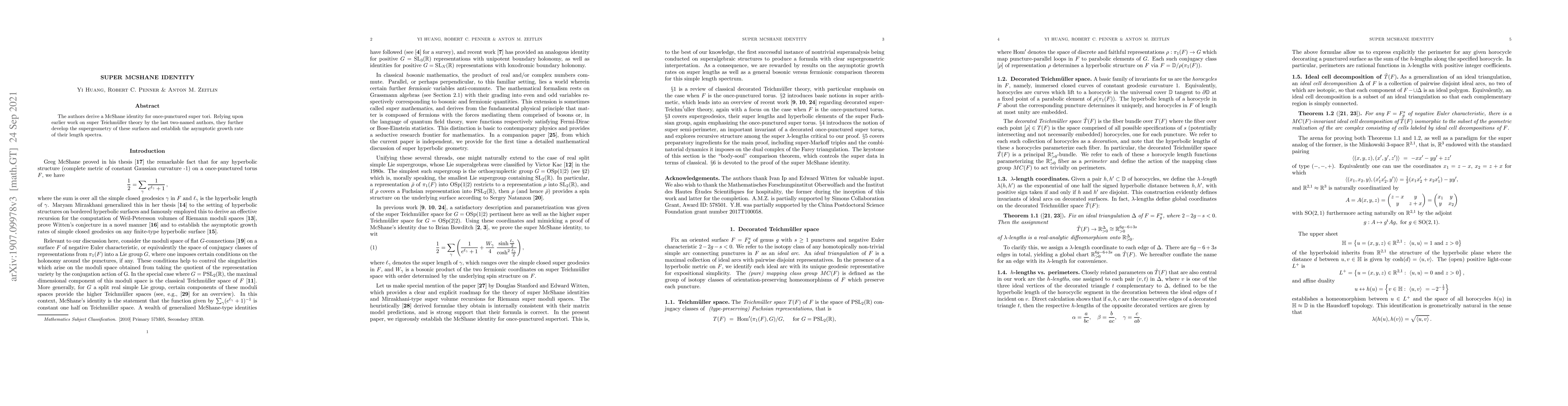 Researchers derived a McShane identity for once-punctured super tori, establishing growth rates of their length spectra, advancing the field of super Teichm"uller theory.