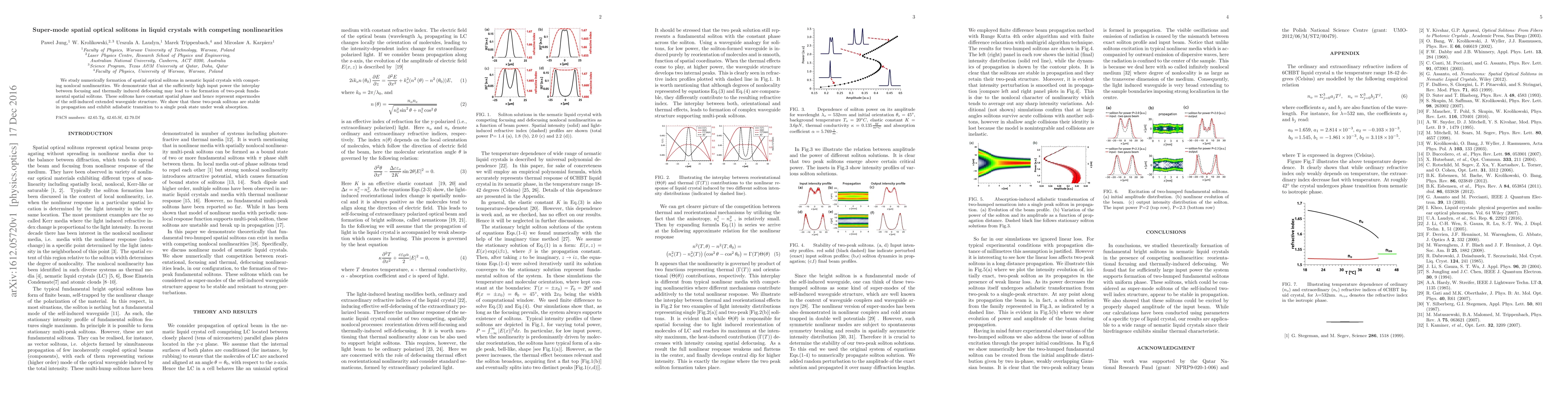 This paper numerically investigates the formation of super-mode spatial optical solitons in nematic liquid crystals with competing nonlocal nonlinearities, revealing the creation of stable two-peak solitons at high input power due to the balance between focusing and thermally induced defocusing. These solitons exhibit adiabatic transition to a single peak under weak absorption.