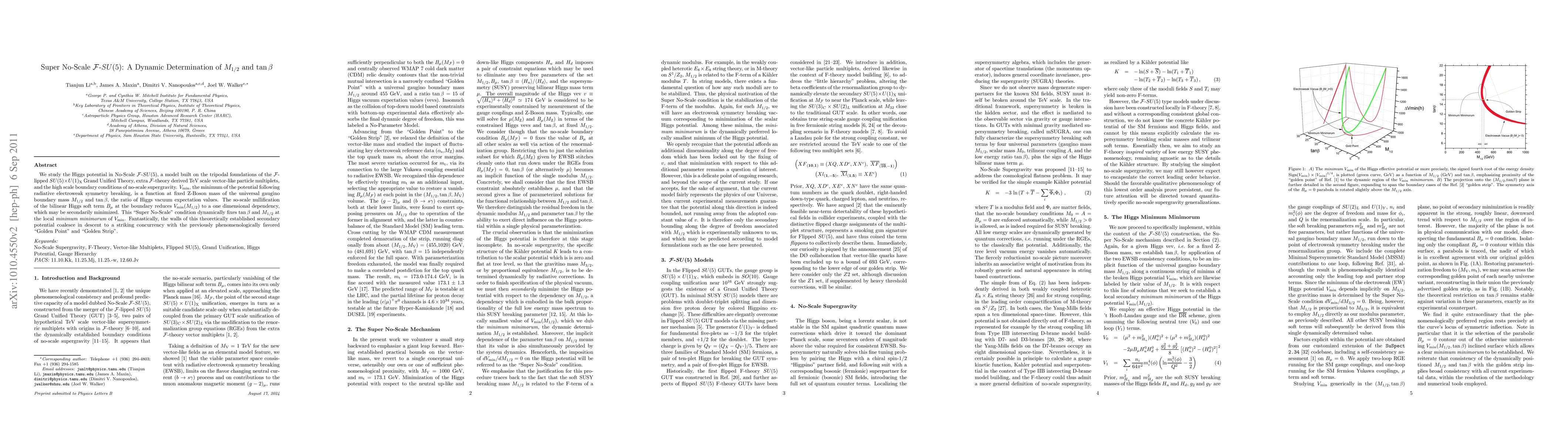 We study the Higgs potential in No-Scale F-SU(5), a model built on the tripodal foundations of the Flipped SU(5) x U(1)_X Grand Unified Theory, extra F-theory derived TeV scale vector-like particle multiplets, and the high scale boundary conditions of No-Scale Supergravity. V_min, the minimum of the potential following radiative electroweak symmetry breaking, is a function at fixed Z-Boson mass of the universal gaugino boundary mass M_{1/2} and tan{\beta}, the ratio of Higgs vacuum expectation values. The No-Scale nullification of the bilinear Higgs soft term B_mu at the boundary reduces V_min(M_{1/2}) to a one dimensional dependency, which may be secondarily minimized. This "Super No-Scale" condition dynamically fixes tan beta and M_{1/2} at the local minimum minimorum of V_min. Fantastically, the walls of this theoretically established secondary potential coalesce in descent to a striking concurrency with the previously phenomenologically favored "golden point" and "golden strip".