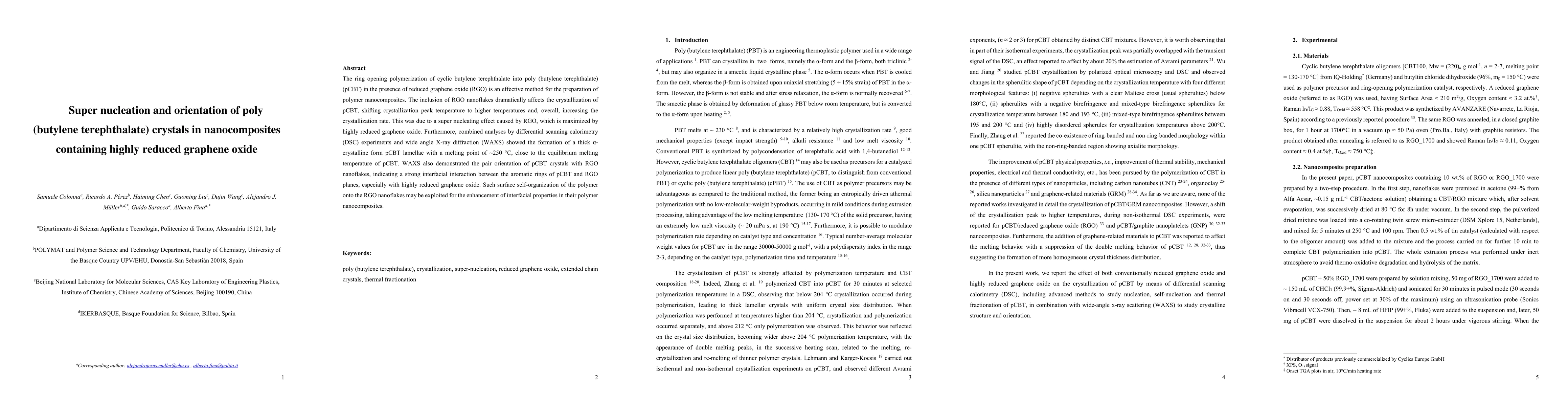 This paper investigates the super nucleation and orientation of poly (butylene terephthalate) crystals in nanocomposites containing highly reduced graphene oxide, finding that RGO enhances crystallization rate and forms a thick α-crystalline form with a melting point near equilibrium. The strong interfacial interaction between RGO and pCBT suggests potential for improved nanocomposite properties.