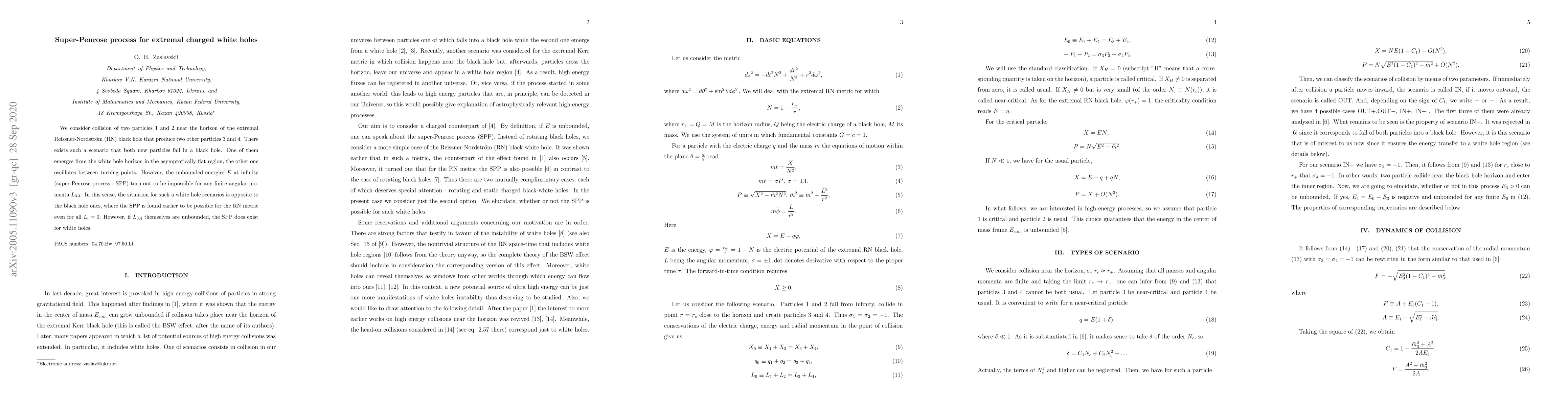 We consider collision of two particles 1 and 2 near the horizon of the extremal Reissner-Nordstr\"{o}m (RN) black hole that produce two other particles 3 and 4. There exists such a scenario that both new particles fall in a black hole. One of them emerges from the white hole horizon in the asymptotically flat region, the other one oscillates between turning points. However, the unbounded energies $E$ at infinity (super-Penrose process - SPP) turn out to be impossible for any finite angular momenta $L_{3.4}$. In this sense, the situation for such a white hole scenarios is opposite to the black hole ones, where the SPP is found earlier to be possible for the RN metric even for all $L_{i}=0$. However, if $L_{3,4}$ themselves are unbounded, the SPP does exist for white holes.