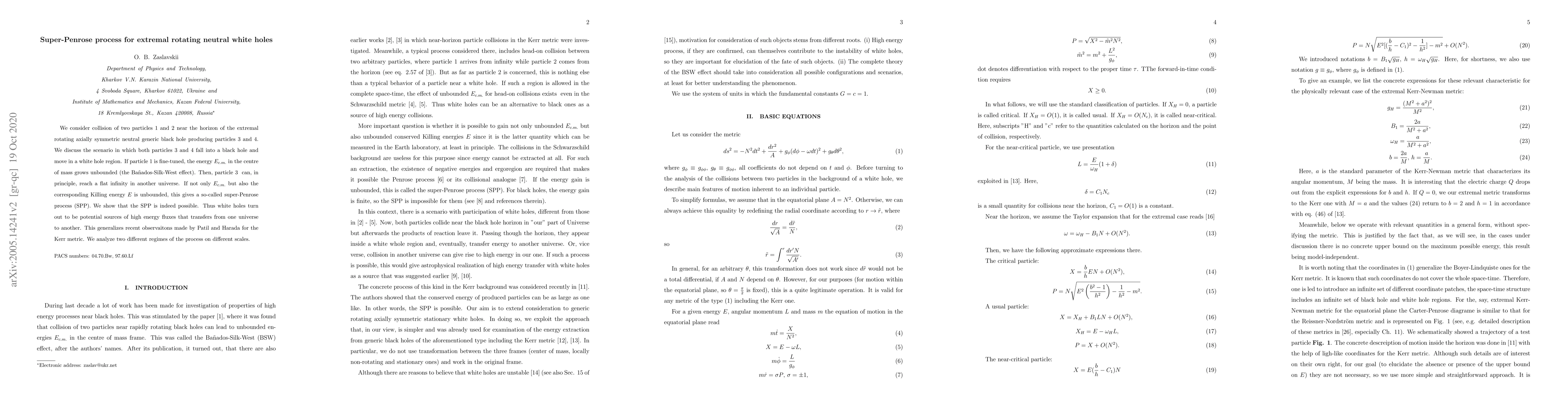 We consider collision of two particles 1 and 2 near the horizon of the extremal rotating axially symmetric neutral generic black hole producing particles 3 and 4. We discuss the scenario in which both particles 3 and 4 fall into a black hole and move in a white hole region. If particle 1 is fine-tuned, the energy $E_{c.m.}$ in the centre of mass grows unbounded (the Ba\~{n}ados-Silk-West effect). Then, particle 3 \ can, in principle, reach a flat infinity in another universe. If not only $E_{c.m.}$ but also the corresponding Killing energy $E$ is unbounded, this gives a so-called super-Penrose process (SPP). We show that the SPP\ is indeed possible. Thus white holes turn out to be potential sources of high energy fluxes that transfers from one universe to another. This generalizes recent observaitons made by Patil and Harada for the Kerr metric. We analyze two different regimes of the process on different scales.