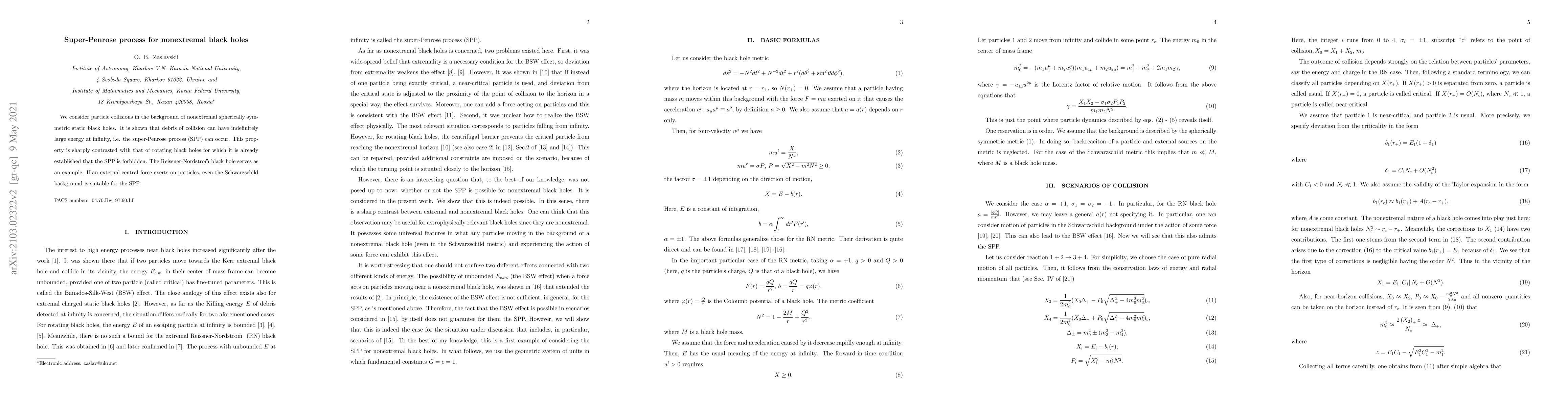 This paper explores particle collisions in nonextremal black holes, demonstrating that debris can achieve indefinitely high energy, thus allowing the super-Penrose process to occur. This contrasts with rotating black holes where the super-Penrose process is forbidden, with the Reissner-Nordstrom black hole and Schwarzschild black hole under external forces serving as examples.