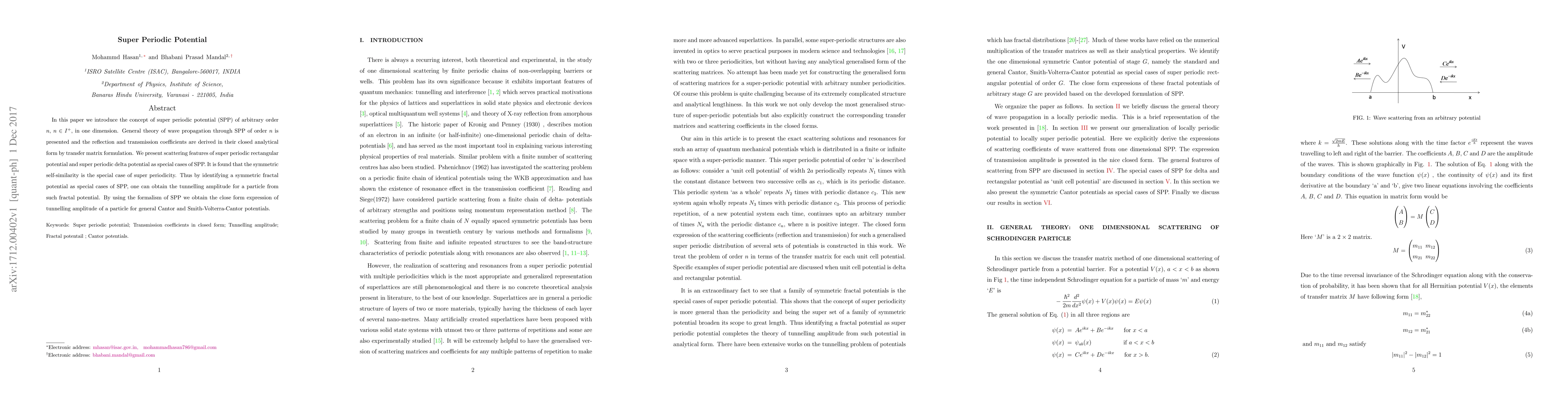 This paper introduces the concept of super periodic potential (SPP) of arbitrary order in one dimension, presenting a general theory of wave propagation and deriving analytical reflection and transmission coefficients. It explores scattering features of specific SPP cases and identifies symmetric fractal potentials as special cases, providing closed form expressions for tunnelling amplitude in general Cantor and Smith-Volterra-Cantor potentials.