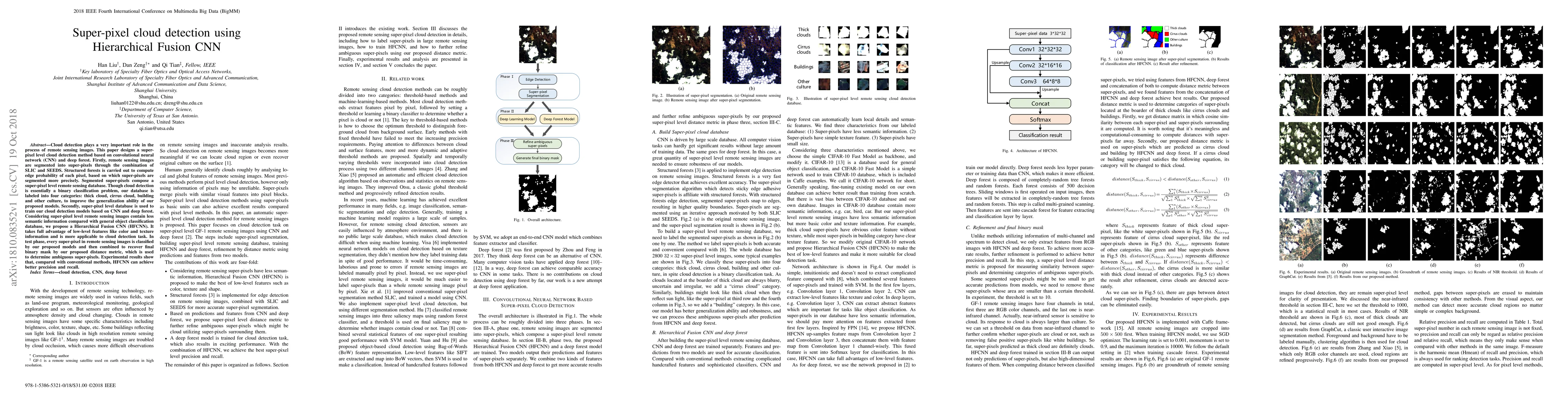 This paper proposes a super-pixel level cloud detection method using Hierarchical Fusion CNN (HFCNN) for remote sensing images, achieving better precision and recall than conventional methods.