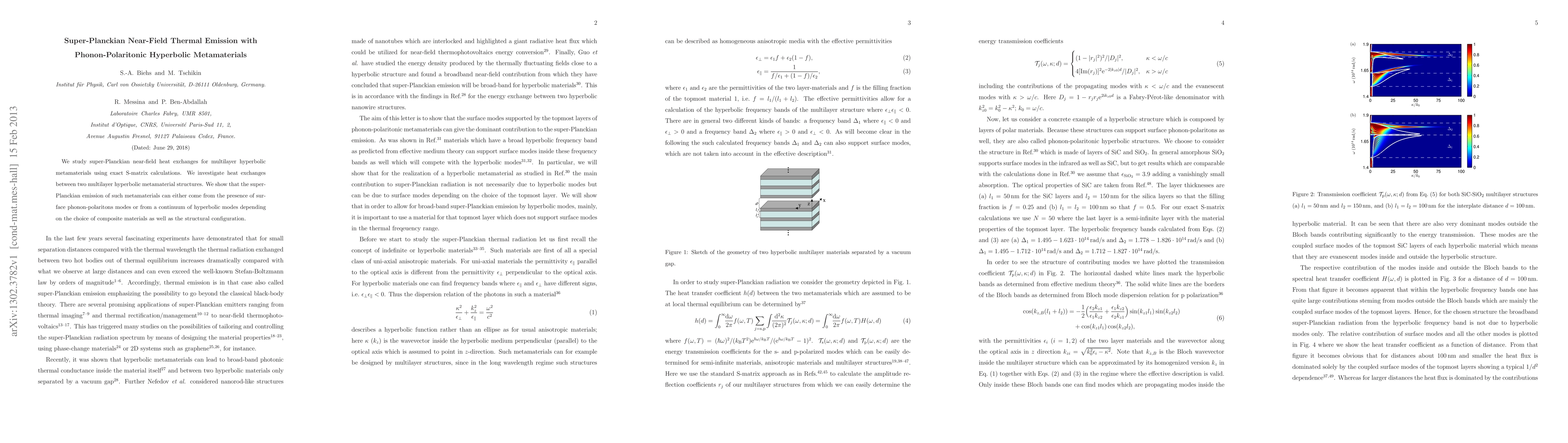 Summary: This research explores super-Planckian thermal emission in multilayer hyperbolic metamaterials, revealing that it can be achieved through surface phonon-polaritons or hyperbolic modes, depending on material choice and structure. Exact S-matrix calculations are used to analyze these heat exchanges.