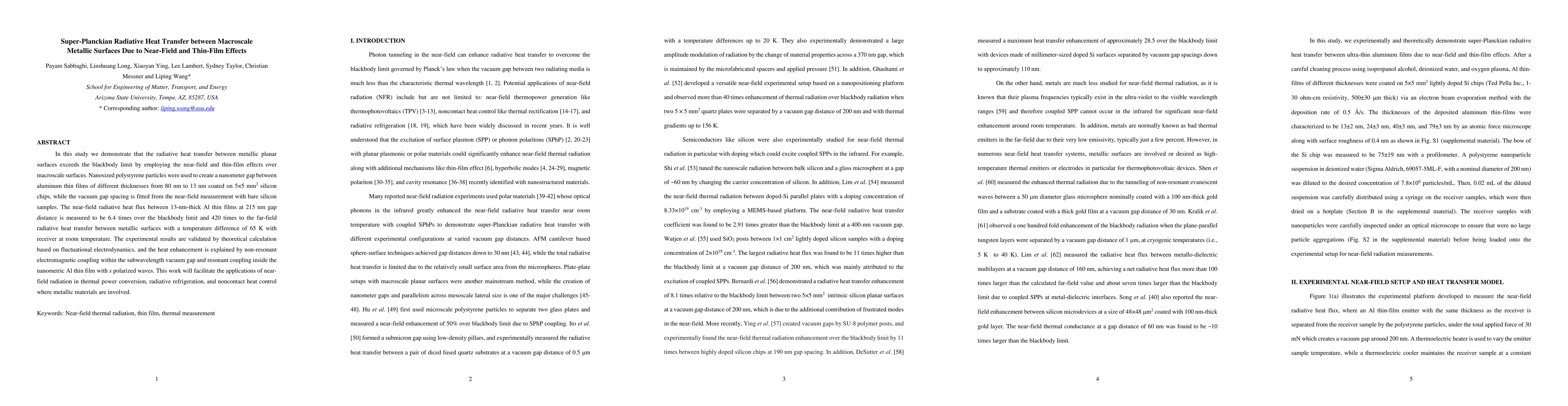 This paper demonstrates experimentally that radiative heat transfer between metallic surfaces can exceed the blackbody limit through near-field and thin-film effects, achieving a 6.4 times increase in heat flux compared to the blackbody limit at a 215 nm gap. Theoretical calculations predict even higher enhancements, suggesting applications in thermal management and noncontact cooling.