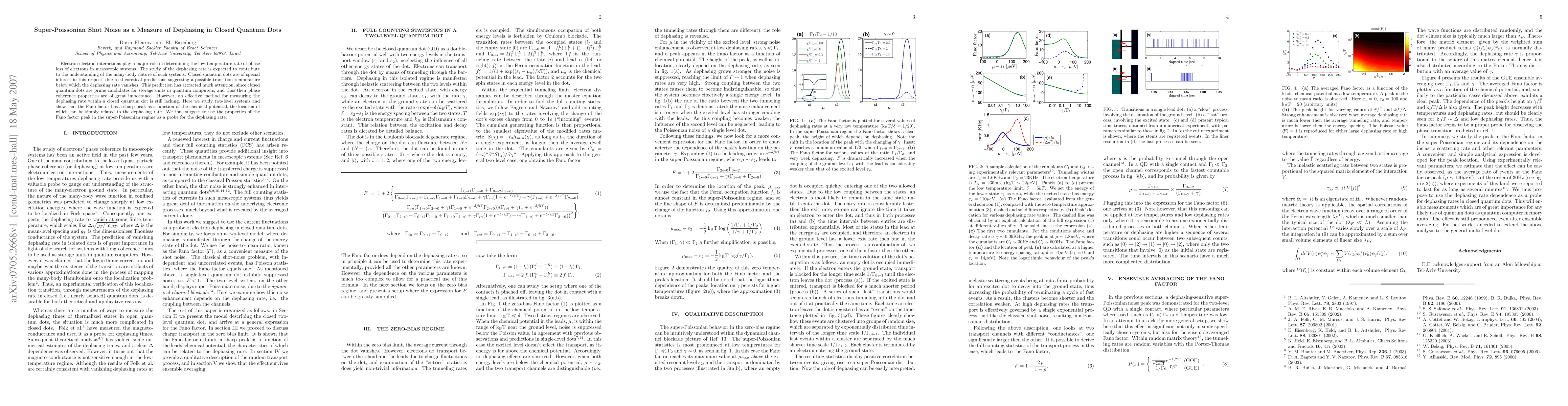 This paper investigates electron-electron interactions in closed quantum dots to measure the dephasing rate, crucial for understanding the many-body nature of mesoscopic systems. The authors propose using the Fano factor's sharp peak in super-Poissonian shot noise as an effective method to determine the dephasing rate.