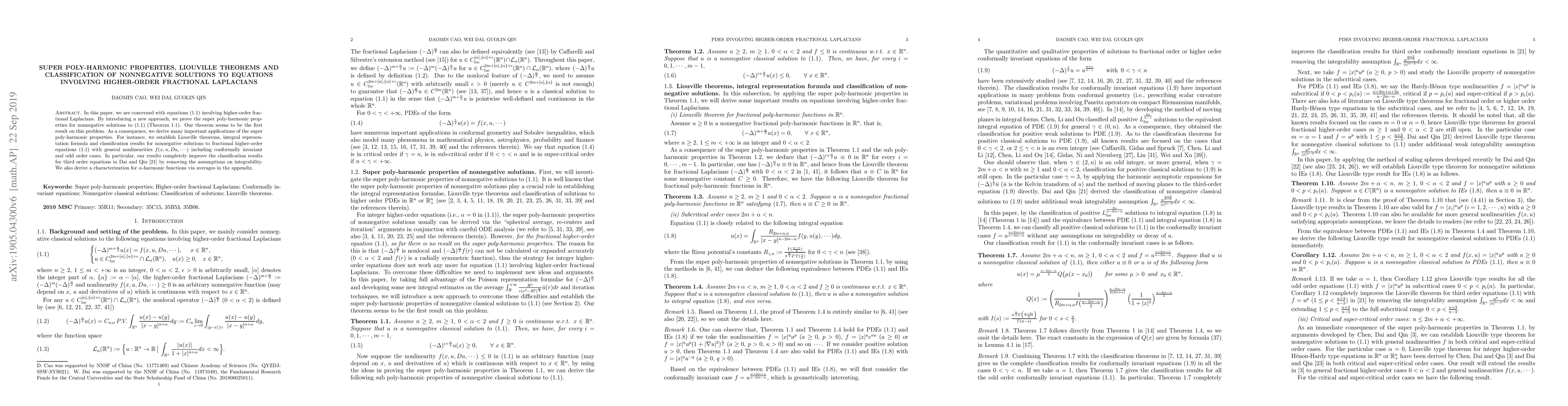 In this paper, we are concerned with equations \eqref{PDE} involving higher-order fractional Laplacians. By introducing a new approach, we prove the super poly-harmonic properties for nonnegative solutions to \eqref{PDE} (Theorem \ref{Thm0}). Our theorem seems to be the first result on this problem. As a consequence, we derive many important applications of the super poly-harmonic properties. For instance, we establish Liouville theorems, integral representation formula and classification results for nonnegative solutions to fractional higher-order equations \eqref{PDE} with general nonlinearities $f(x,u,Du,\cdots)$ including conformally invariant and odd order cases. In particular, our results completely improve the classification results for third order equations in Dai and Qin \cite{DQ1} by removing the assumptions on integrability. We also derive a characterization for $\alpha$-harmonic functions via averages in the appendix.