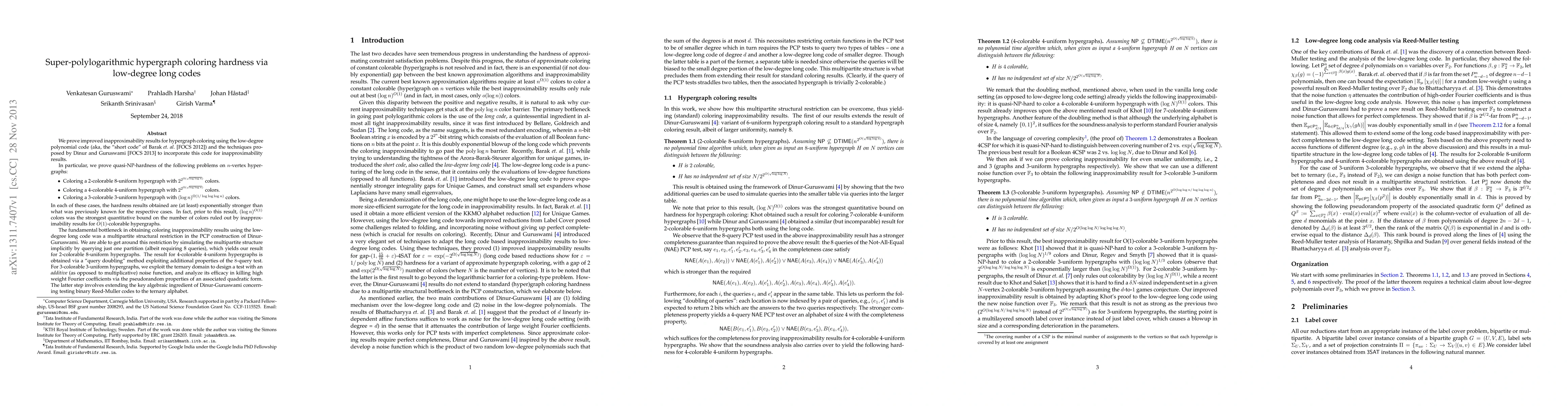 This paper establishes super-polylogarithmic hardness for hypergraph coloring by leveraging low-degree long codes and advanced PCP techniques, achieving quasi-NP-hard results that exponentially surpass previous bounds. Specifically, it improves inapproximability for 2-colorable 8-uniform, 4-colorable 4-uniform, and 3-colorable 3-uniform hypergraphs.
