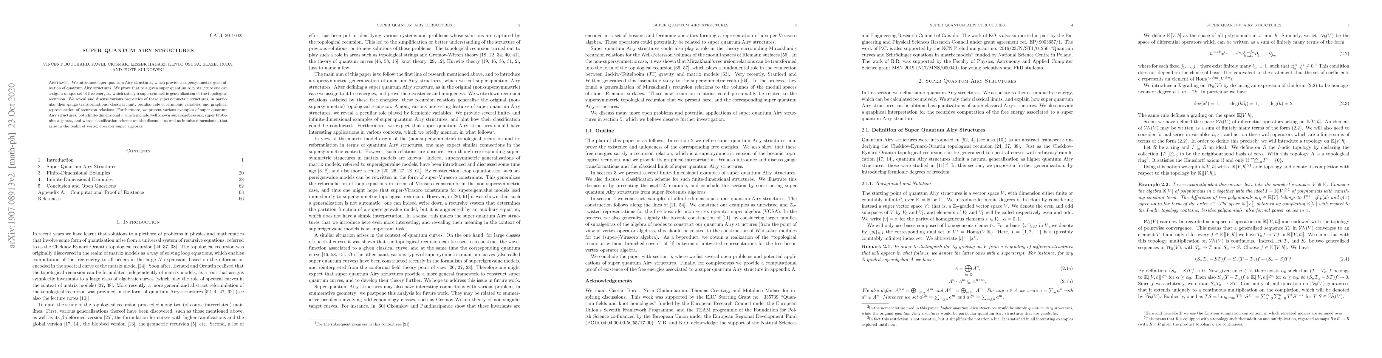 This paper introduces super quantum Airy structures, a supersymmetric generalization of quantum Airy structures, and demonstrates their unique set of free energies satisfying a topological recursion. It explores their properties, including gauge transformations and graphical recursion relations, and provides examples from finite-dimensional superalgebras and infinite-dimensional vertex operator superalgebras.