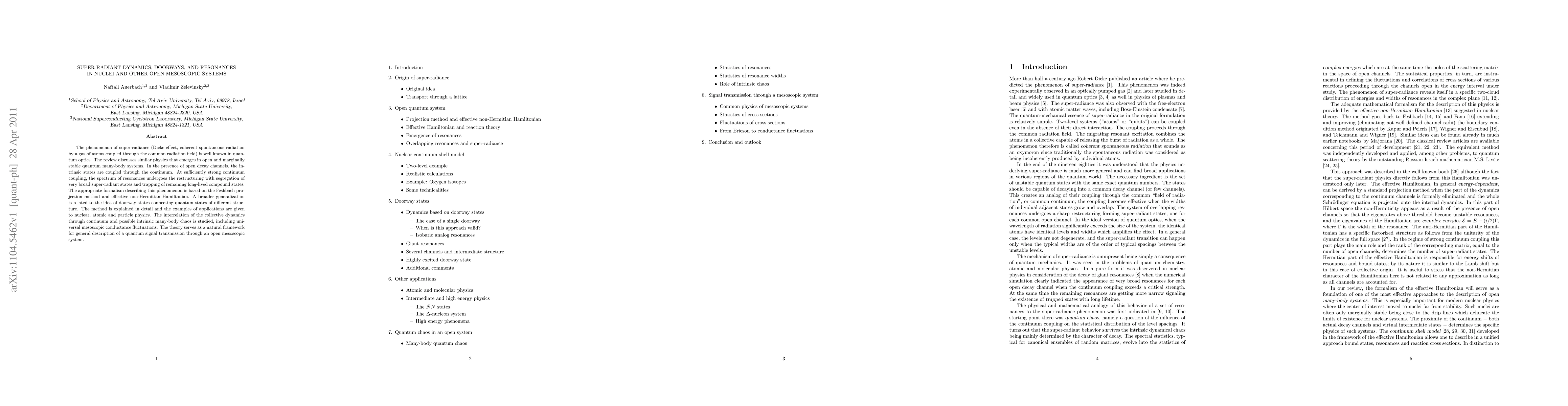 The phenomenon of super-radiance (Dicke effect, coherent spontaneous radiation by a gas of atoms coupled through the common radiation field) is well known in quantum optics. The review discusses similar physics that emerges in open and marginally stable quantum many-body systems. In the presence of open decay channels, the intrinsic states are coupled through the continuum. At sufficiently strong continuum coupling, the spectrum of resonances undergoes the restructuring with segregation of very broad super-radiant states and trapping of remaining long-lived compound states. The appropriate formalism describing this phenomenon is based on the Feshbach projection method and effective non-Hermitian Hamiltonian. A broader generalization is related to the idea of doorway states connecting quantum states of different structure. The method is explained in detail and the examples of applications are given to nuclear, atomic and particle physics. The interrelation of the collective dynamics through continuum and possible intrinsic many-body chaos is studied, including universal mesoscopic conductance fluctuations. The theory serves as a natural framework for general description of a quantum signal transmission through an open mesoscopic system.