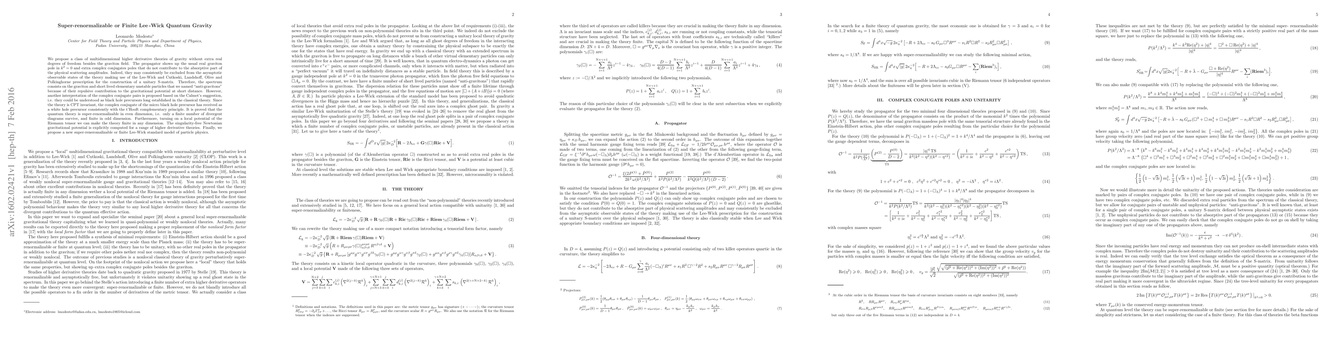 We propose a class of multidimensional higher derivative theories of gravity without extra real degrees of freedom besides the graviton field. The propagator shows up the usual real graviton pole and extra complex conjugates poles that do not contribute to the absorptive part of the physical scattering amplitudes. Indeed, they may consistently be excluded from the asymptotic observable states of the theory making use of the Lee-Wick and Cutkoski, Landshoff, Olive and Polkinghorne prescription for the construction of a unitary S-matrix. Therefore, the spectrum consists on the graviton and short lived elementary unstable particles that we named "anti-gravitons" because of their repulsive contribution to the gravitational potential at short distance. However, another interpretation of the complex conjugate pairs is proposed based on the Calmet's suggestion, i.e. they could be understood as black hole precursors long established in the classical theory. Since the theory is CPT invariant, the complex conjugate of the micro black hole precursor has received as a white hole precursor consistently with the t'Hooft complementary principle. It is proved that the quantum theory is super-renormalizable in even dimension, i.e. only a finite number of divergent diagrams survive, and finite in odd dimension. Furthermore, turning on a local potential of the Riemann tensor we can make the theory finite in any dimension. The singularity-free Newtonian gravitational potential is explicitly computed for a range of higher derivative theories. Finally, we propose a new super-reneromalizable or finite Lee-Wick standard model of particle physics.