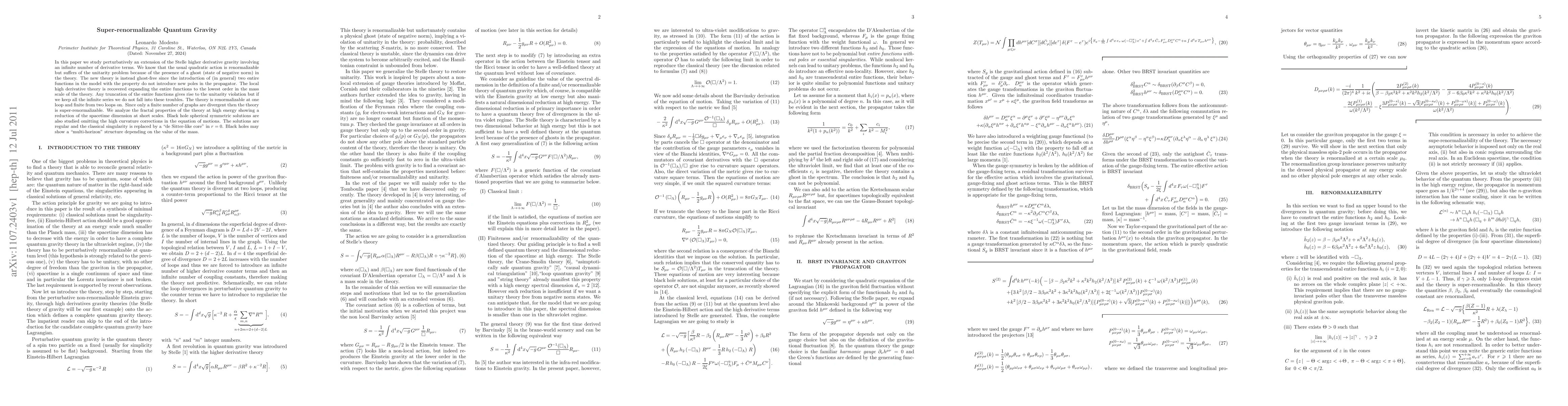 In this paper we study perturbatively an extension of the Stelle higher derivative gravity involving an infinite number of derivative terms. We know that the usual quadratic action is renormalizable but suffers of the unitarity problem because of the presence of a ghost (state of negative norm) in the theory. The new theory is instead ghost-free since the introduction of (in general) two entire functions in the model with the property do not introduce new poles in the propagator. The local high derivative theory is recovered expanding the entire functions to the lowest order in the mass scale of the theory. Any truncation of the entire functions gives rise to the unitarity violation but if we keep all the infinite series we do not fall into these troubles. The theory is renormalizable at one loop and finite from two loops on. Since only a finite number of graphs are divergent then the theory is super-renormalizable. We analyze the fractal properties of the theory at high energy showing a reduction of the spacetime dimension at short scales. Black hole spherical symmetric solutions are also studied omitting the high curvature corrections in the equation of motions. The solutions are regular and the classical singularity is replaced by a "de Sitter-like core" in r=0. Black holes may show a "multi-horizon" structure depending on the value of the mass.