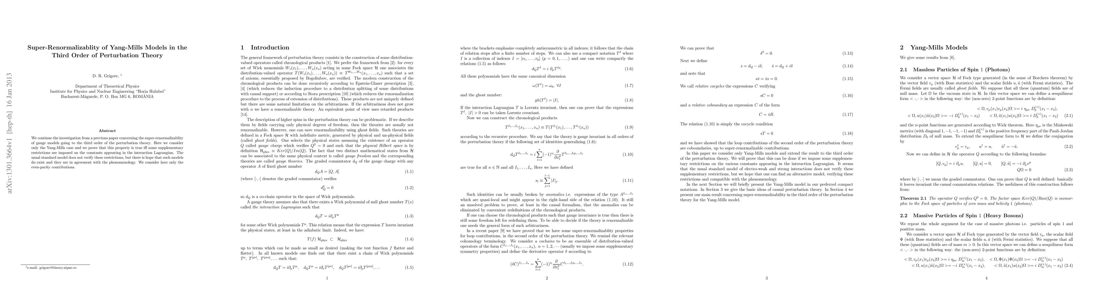 We continue the investigation from a previous paper concerning the super-renormalizablity of gauge models going to the third order of the perturbation theory. Here we consider only the Yang-Mills case and we prove that this property is true iff some supplementary restrictions are imposed on the constants appearing in the interaction Lagrangian. The usual standard model does not verify these restrictions, but there is hope that such models do exist and they are in agreement with the phenomenology. We consider here only the even-parity contributions.