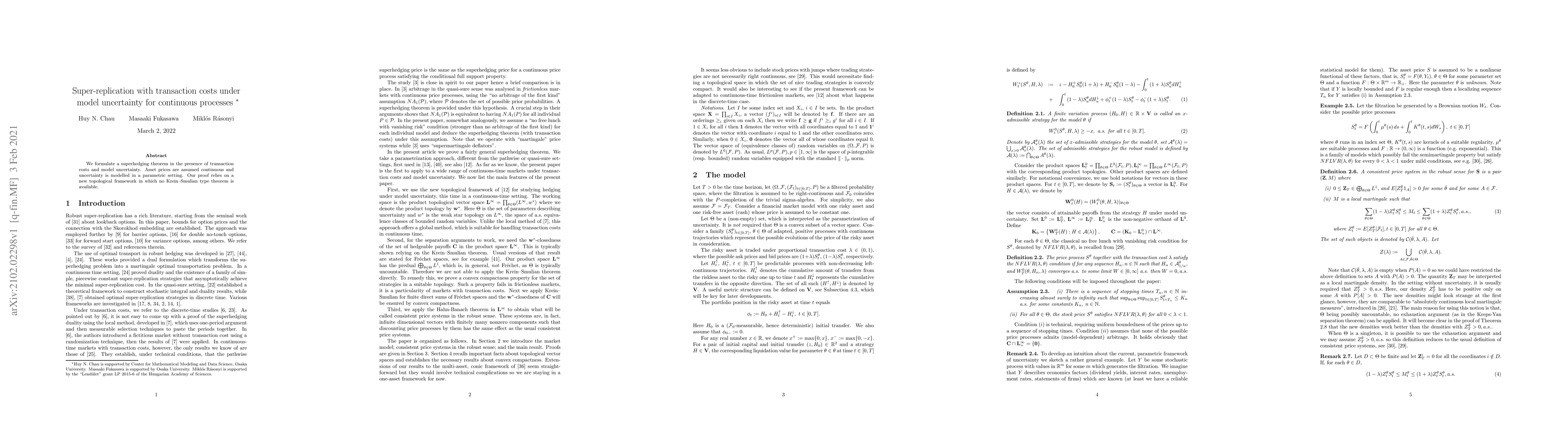 Summary: This paper formulates a superhedging theorem for continuous asset prices under transaction costs and model uncertainty, employing a novel topological framework that circumvents the need for Krein-Smulian type theorems. The approach addresses model uncertainty in a parametric setting.