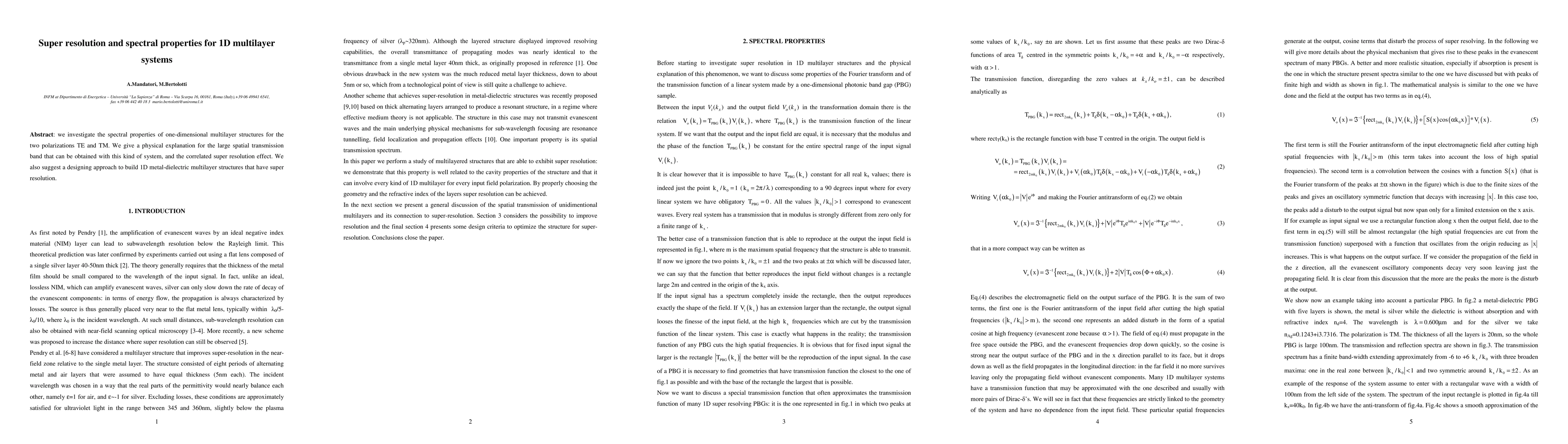This paper explores the spectral properties of 1D multilayer systems for TE and TM polarizations, explaining the large spatial transmission band and the associated super resolution effect. It proposes a design strategy for creating 1D metal-dielectric multilayers with enhanced super resolution capabilities.