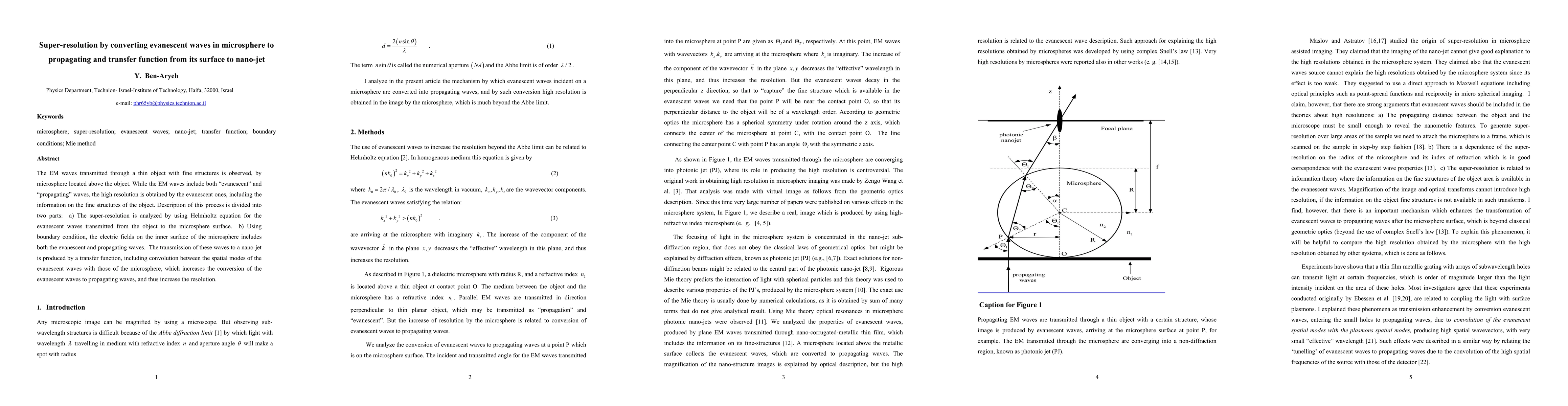 This research paper describes a method for achieving super-resolution imaging by converting evanescent waves transmitted through a thin object to propagating waves using a microsphere. It utilizes the Helmholtz equation and boundary conditions to analyze the waves on the microsphere's surface, and employs a transfer function to enhance the resolution via a nano-jet.