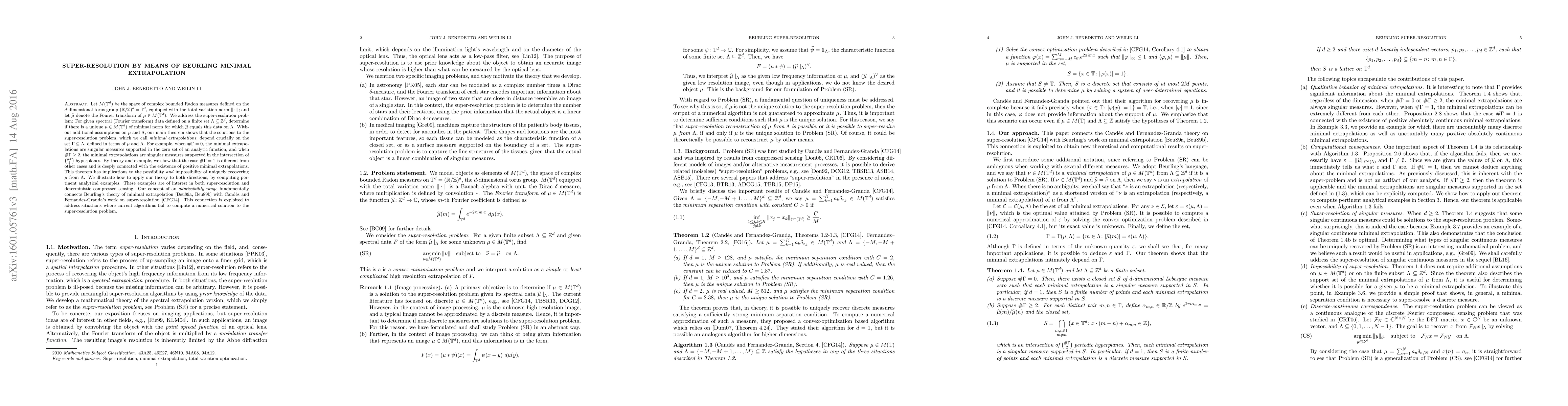 Let $M(\mathbb{T}^d)$ be the space of complex bounded Radon measures defined on the $d$-dimensional torus group $(\mathbb{R}/\mathbb{Z})^d=\mathbb{T}^d$, equipped with the total variation norm $\|\cdot\|$; and let $\hat\mu$ denote the Fourier transform of $\mu\in M(\mathbb{T}^d)$. We address the super-resolution problem: For given spectral (Fourier transform) data defined on a finite set $\Lambda\subset\mathbb{Z}^d$, determine if there is a unique $\mu\in M(\mathbb{T}^d)$ of minimal norm for which $\hat\mu$ equals this data on $\Lambda$. Without additional assumptions on $\mu$ and $\Lambda$, our main theorem shows that the solutions to the super-resolution problem, which we call minimal extrapolations, depend crucially on the set $\Gamma\subset\Lambda$, defined in terms of $\mu$ and $\Lambda$. For example, when $\Gamma=0$, the minimal extrapolations are singular measures supported in the zero set of an analytic function, and when $\Gamma\geq 2$, the minimal extrapolations are singular measures supported in the intersection of $\Gamma\choose 2$ hyperplanes. By theory and example, we show that the case $\Gamma=1$ is different from other cases and is deeply connected with the existence of positive minimal extrapolations. This theorem has implications to the possibility and impossibility of uniquely recovering $\mu$ from $\Lambda$. We illustrate how to apply our theory to both directions, by computing pertinent analytical examples. These examples are of interest in both super-resolution and deterministic compressed sensing. Our concept of an admissibility range fundamentally connects Beurling's theory of minimal extrapolation with Candes and Fernandez-Granda's work on super-resolution. This connection is exploited to address situations where current algorithms fail to compute a numerical solution to the super-resolution problem.
