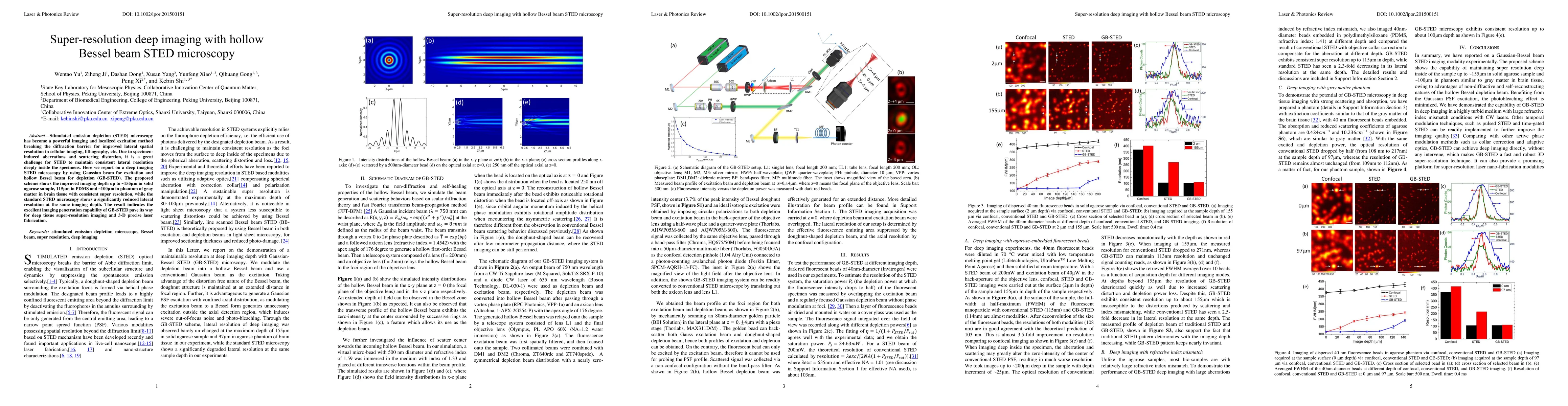 This paper proposes a novel GB-STED microscopy using a hollow Bessel beam for depletion, which significantly improves imaging depth and maintains super-resolution in deep specimens, achieving up to 155 μm in solid agarose samples compared to standard STED.