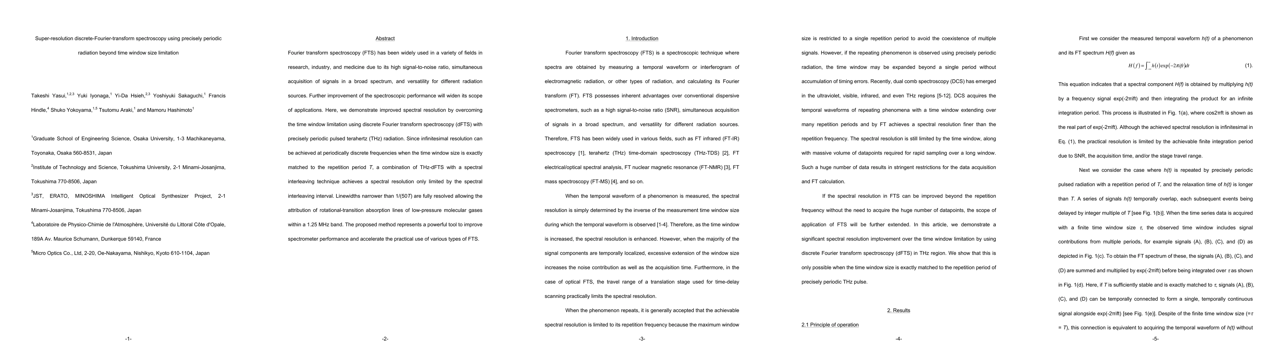 Fourier transform spectroscopy (FTS) has been widely used in a variety of fields in research, industry, and medicine due to its high signal-to-noise ratio, simultaneous acquisition of signals in a broad spectrum, and versatility for different radiation sources. Further improvement of the spectroscopic performance will widen its scope of applications. Here, we demonstrate improved spectral resolution by overcoming the time window limitation using discrete Fourier transform spectroscopy (dFTS) with precisely periodic pulsed terahertz (THz) radiation. Since infinitesimal resolution can be achieved at periodically discrete frequencies when the time window size is exactly matched to the repetition period T, a combination of THz-dFTS with a spectral interleaving technique achieves a spectral resolution only limited by the spectral interleaving interval. Linewidths narrower than 1/(50T) are fully resolved allowing the attribution of rotational-transition absorption lines of low-pressure molecular gases within a 1.25 MHz band. The proposed method represents a powerful tool to improve spectrometer performance and accelerate the practical use of various types of FTS.