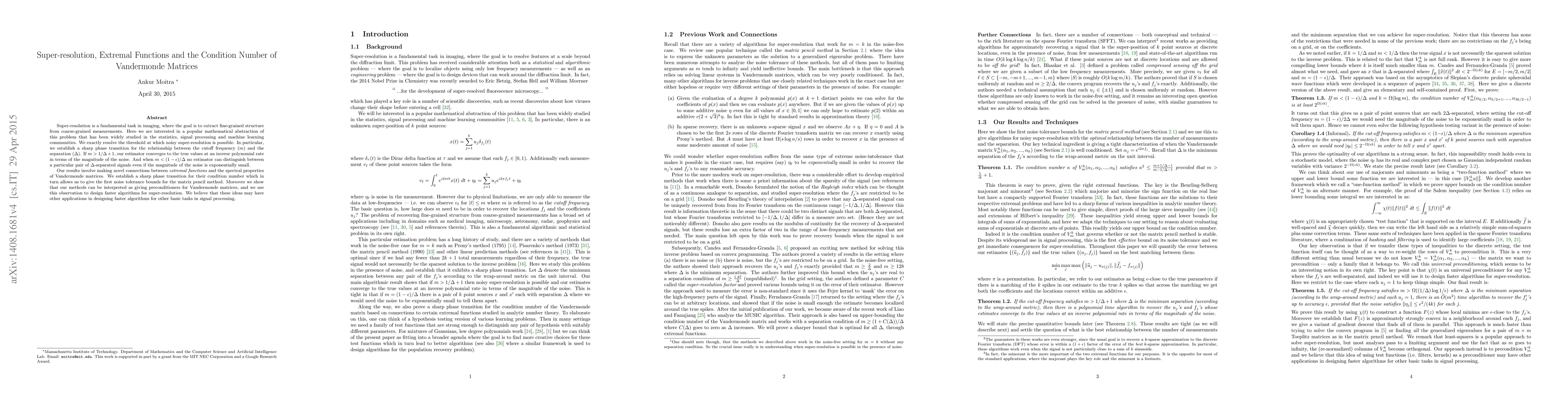 Super-resolution is a fundamental task in imaging, where the goal is to extract fine-grained structure from coarse-grained measurements. Here we are interested in a popular mathematical abstraction of this problem that has been widely studied in the statistics, signal processing and machine learning communities. We exactly resolve the threshold at which noisy super-resolution is possible. In particular, we establish a sharp phase transition for the relationship between the cutoff frequency ($m$) and the separation ($\Delta$). If $m > 1/\Delta + 1$, our estimator converges to the true values at an inverse polynomial rate in terms of the magnitude of the noise. And when $m < (1-\epsilon) /\Delta$ no estimator can distinguish between a particular pair of $\Delta$-separated signals even if the magnitude of the noise is exponentially small. Our results involve making novel connections between {\em extremal functions} and the spectral properties of Vandermonde matrices. We establish a sharp phase transition for their condition number which in turn allows us to give the first noise tolerance bounds for the matrix pencil method. Moreover we show that our methods can be interpreted as giving preconditioners for Vandermonde matrices, and we use this observation to design faster algorithms for super-resolution. We believe that these ideas may have other applications in designing faster algorithms for other basic tasks in signal processing.