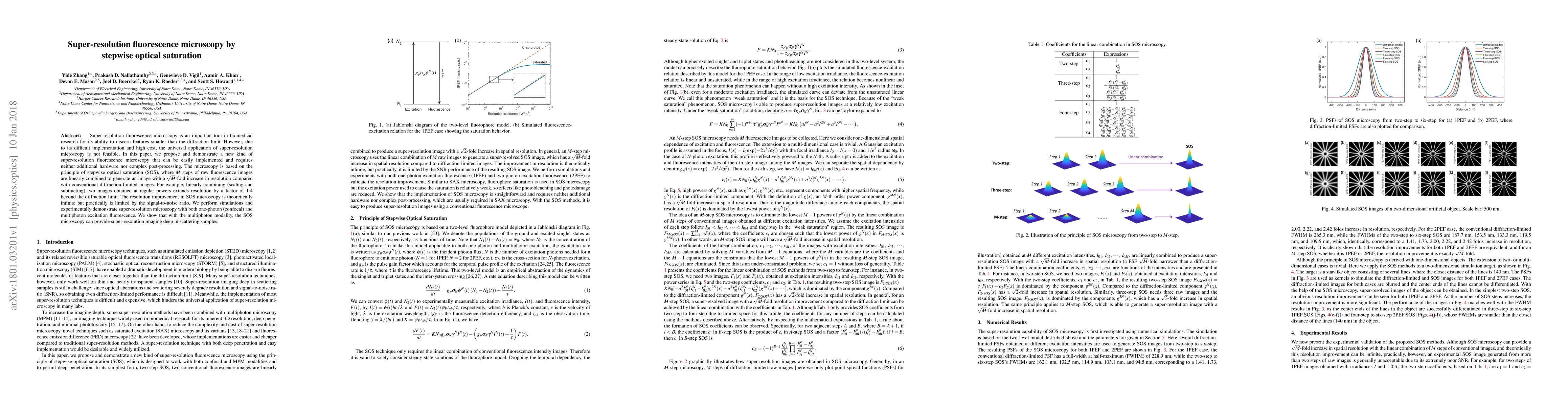 This paper proposes a novel super-resolution fluorescence microscopy technique based on stepwise optical saturation (SOS) that achieves enhanced resolution without additional hardware or complex post-processing, demonstrating its feasibility through simulations and experiments with both confocal and multiphoton excitation. SOS microscopy theoretically allows infinite resolution improvement but is practically limited by signal-to-noise ratio.